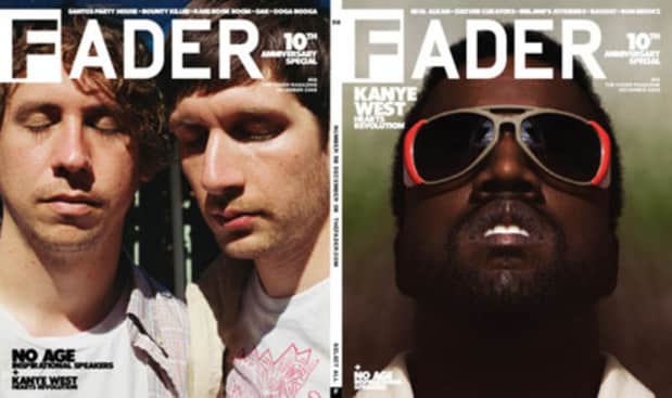Depending on where you are, The FADER's 10th Anniversary Issue will hit newsstands and iTunes sometime in the next week or so. Since we already did a big retrospective thing in our 50th issue, we decided to just go out and get some guys from around the way for this one: KANYE WEST and NO AGE. Both covers are exclusives, so make sure to snatch this up whenever you see it, and check back Tuesday, November 25th, when we will put the whole thing up for download and begin a series of online extras only available here on TheFADER.com (and probably Kanye's blog).