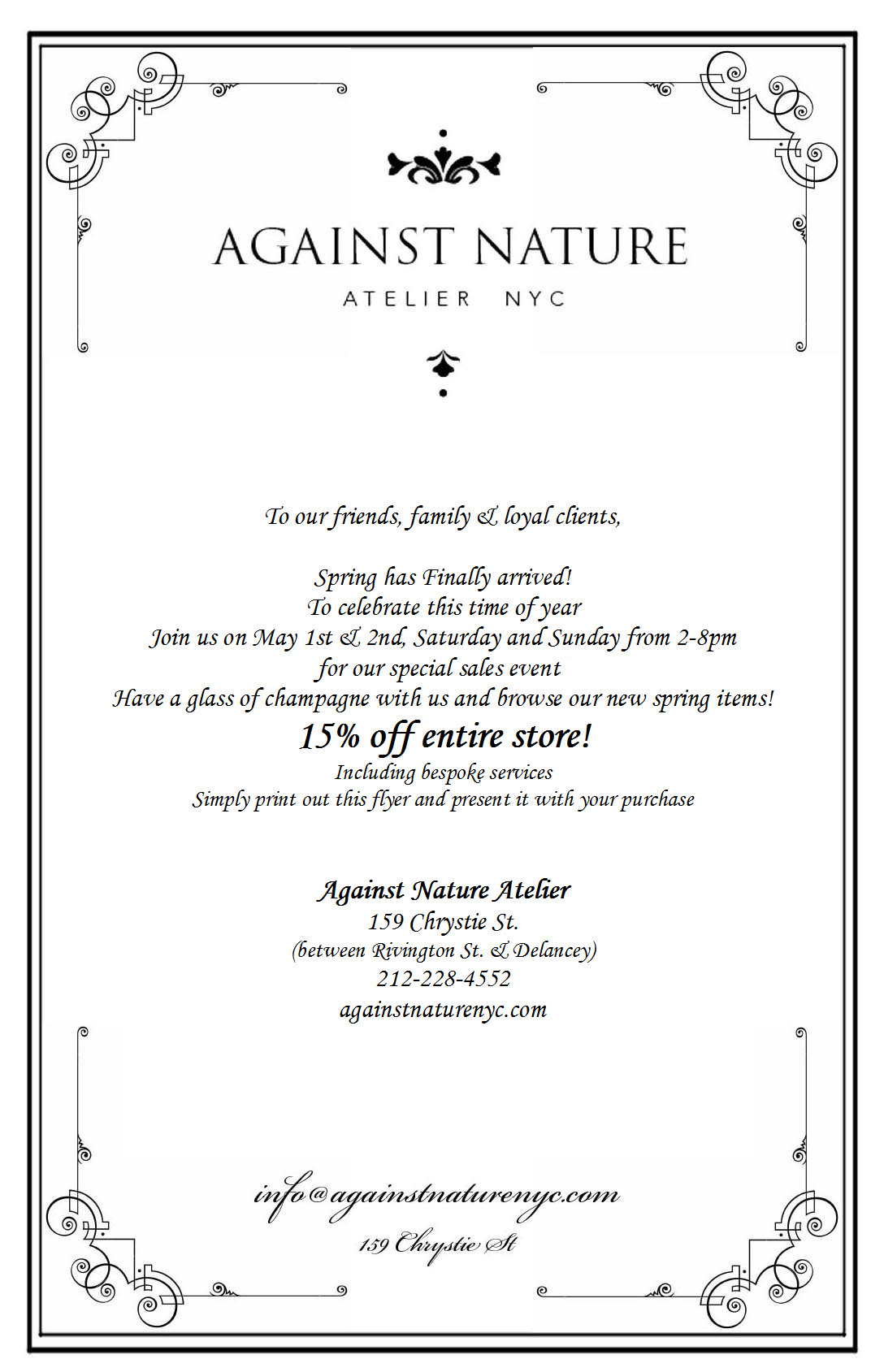 Against Nature is the type of store that's worth saving up your pennies for. It stands apart from other shops by offering everything custom, from jewelry to bags to belts. The crowning glory of the place is definitely the bespoke suiting, which is perfected for each customer via a six week process that involves three fittings. This weekend, Against Nature is offering a 15% discount off their services, and they'll be debuting their new spring items too. Just print out the flyer after the jump to claim, and your custom jobs will cost a bit less.