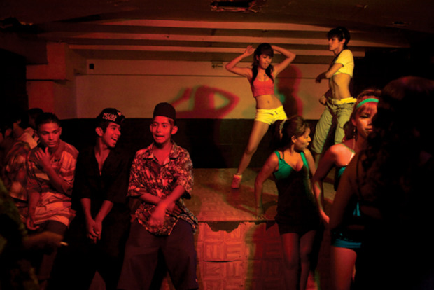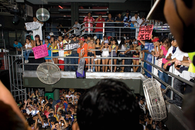 Every Sunday afternoon, roughly 4000 teens gather at the ArcoIris club in downtown Monterrey. Standing outside the venue’s nondescript doorways, it’s impossible to guess what’s happening inside. Twin brothers in clown makeup sit on the curb, too poor to enter. Admission costs about $3 for boys, $2 for girls. Baldhead cholos with their eyebrows shaved off walk by wearing near-identical brown button-up shirts and oversized khaki shorts, their white socks pulled high. A woman in a Saint Judas T-shirt sells loose cigarettes, amaranth bars, and tiny plastic-wrapped studs so the kids can customize their piercings before entering. The boys pay more attention (and money) to their hairdos and clothes than the girls, who gravitate towards halter-tops and hot pants—sexy/functional for the sticky, 100-degree heat.