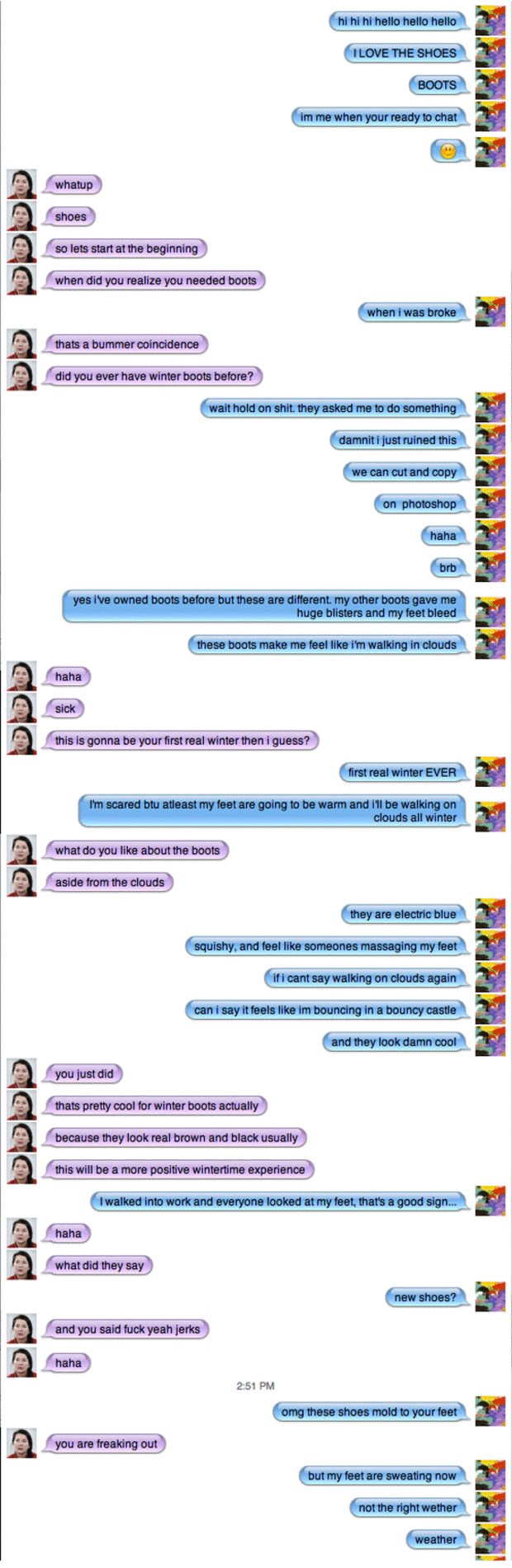 Every week a different FADER family member will pick a clothing item or accessory that he or she has lately been spending a lot of time with—or would like to—and write a little love letter to it. This week photographer and all around bon vivant Sandy Kim hoped to talk about the makings of a perfect boot, no easy task since a love of clothing is often more complicated and instinctual than old fashioned prose allows. Today's reality is that true love often needs emoticons, brbs, and hahas to capture its complexity, so we decided to let Sandy describe her brand new Native Shoes in the most liberated way possible, on iChat with FADER Editor Matthew Schnipper. The shot above and the one after the jump are by Kim herself, photo odes to her favorite new pair of shoes.