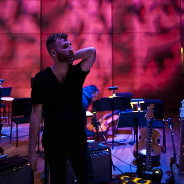 It was an intimacy totally shattered by the arrival of the 29 strings of Sinfonietta Cracovia, whose performances of Krzysztof Penderecki and Steve Reich compositions preceded the big Frost-Bjarnason collaboration. The flesh and blood orchestra wore all black, an enormous mob led by concertmaster Robert Kabara, who played the violin too so no one on stage was standing. They’d play these huge all-string pieces, everyone nailing the same note together, a sea of bows stabbing the air above in general unison. There was a huge screen overhead and we’re watching birds fly backwards and slow motion zooms on hypercities made from cubes cut out of cubes, and it was really terrifying. Then four or five songs in, they did Steve Reich’s “Duet for Two Violins and String Ensemble,” and on screen there was a big red round thing we’re falling into like a wax stamp or something on the ceiling or an upside down starfish. I swear I've never felt so calm in New York.