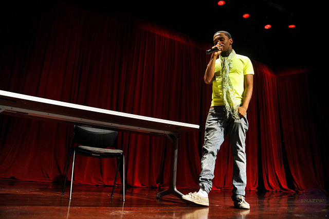 [Audience member: "What inspires you?"] You guys. It's you, bruh. Being here, we could be brothers now. It's good, regardless. And everybody, speak both languages too. Listen to slang. Slang is like learning another language. Be bilingual and go learn some slang. For sheezy! Brang dang dang. If you know some slang, rep that. You feel me? You feel me?! Yeah, bruh. Use swag, yeah, dummy.