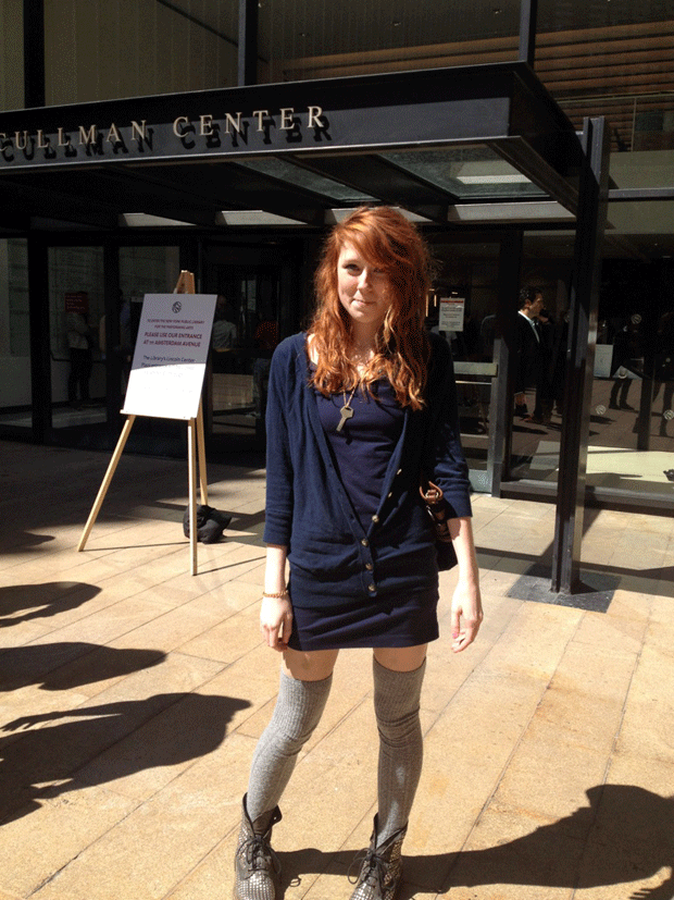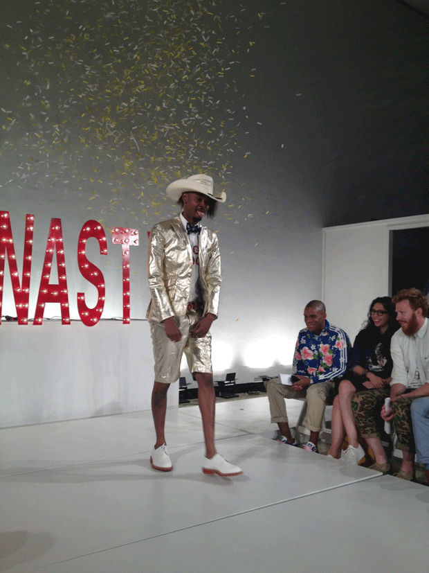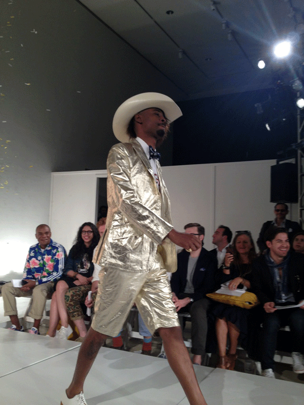 During New York Fashion Week, flocks of fashion editors, stylists, models and fans flaunt their best and brightest outfits, shoes and attitudes like proud peacocks. We spotted former co-models Danny Brown and Kitty Pryde at the Mark McNairy show and had to snap some pictures. Brown closed out the runway show in a gold lamé short suit. Pryde, keeping it real in Forever 21, was just there to lend support.