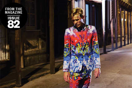 If you live in London, don’t be surprised if you recognize one of the graffiti scribbles or tree bark patterns that adorn Matthew Miller’s fall collection on your morning walk to the tube. Each print from his debut collection is a photograph of a specific spot in the city that’s been digitally transferred onto his garments. A native of Stoke-on-Trent, Miller was so enamored with his adopted home that, to find inspiration, he wandered the streets for up to seven hours every day, photographing what he saw. “I wanted to find the right surfaces that represented London,” he says. “Not necessarily always the most beautiful ones like the marbles and the granites, but also where the riots had happened, the graffiti.” His daily walks led him from the heart of London all the way out to its industrial and suburban perimeter. His favorite surfaces—eroding stone, a tree in Hyde Park and particle board covering a shop window during the 2011 riots—served as unexpected prints for his well-tailored two-button blazers, oxford shirts and backpacks, turning his fall collection into an expertly crafted, tactile Instagram feed.