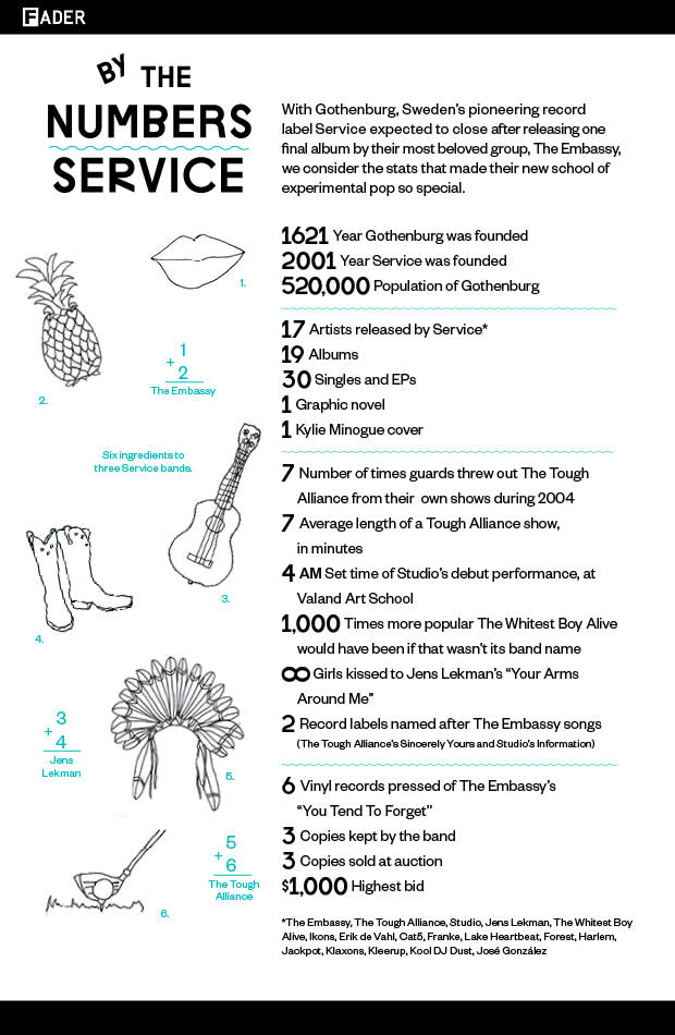 In By The Numbers, FADER looks at a big record release and breaks it down in basic digits. In FADER #82, we actually took on a record label: Gothenberg, Sweden's Service, which, with 19 albums and over a decade of experimental pop under its belt, plans to close up shop next year following a final release from its flagship group, The Embassy.