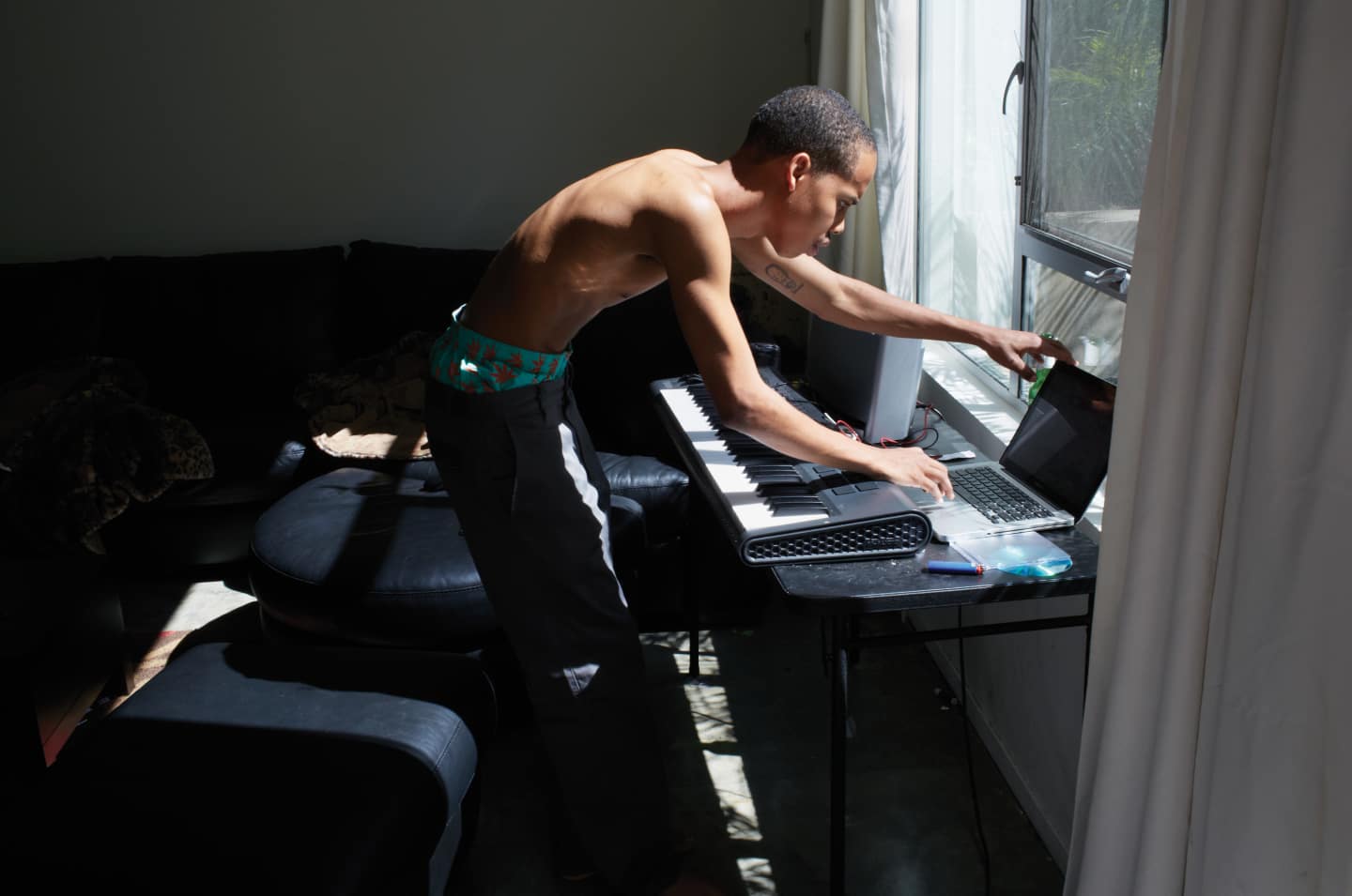 The studio Earl uses is Mac’s converted pool house. It’s ensconced in ambient red light and features a gigantic Buddha head. There’s a large keyboard, a wall-mounted flatscreen TV and professional studio monitors. According to Forbes, Mac made $6.5 million last year. He released five mix tapes before his first studio album while grappling with a promethazine addiction that he’s since kicked. The trajectory makes you wonder what might have happened had Earl stayed his course—whether or not he would be a millionaire, if he’d have squandered his spoils succumbing to escalated drug use, or if by now he’d be a colorless rapper with a flabby viewpoint and nothing to prove. It also reminds you that despite Samoa, Earl is still young enough to be corruptible. There’s a moment when Earl and Mac rap silly jokes to each other in a huddle, whispering gleefully, and they look like college kids cutting class. They plow through styrofoam containers of Korean-Hawaiian grilled chicken and watch a rerun of Tyler’s recent appearance on Fallon, debuting “Treehome95.” Tyler’s grinning, sunglassed face moves across the screen from behind a shiny black piano that he plays beautifully. “We’ve been waiting so long for America to see this,” Earl says. “To see his appeal. Tyler’s so good I hate it.”