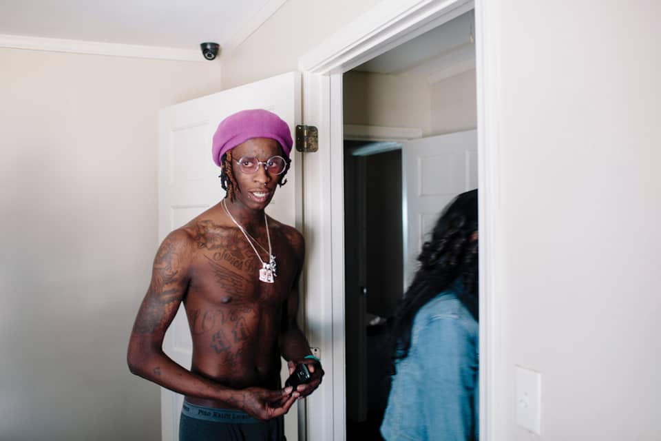 Stretched out on a leather couch in a small Midtown Atlanta apartment, Young Thug sips a pink smoothie as he describes the housing projects he grew up in. “Anything you see wrong with me came from my projects, Jonesboro South,” he says, running an index finger over the piercing in his lower lip. Born Jeffrey Williams, the 21-year-old rapper and newest member of Gucci Mane’s 1017 Brick Squad empire sits low in a gray hoodie and tight jeans, his face a network of inscrutable tattoos. Along his right cheekbone is a thin but prominent scar. “Jonesboro,” he repeats, shaking his head. “You know how roaches look, right? And rats?”