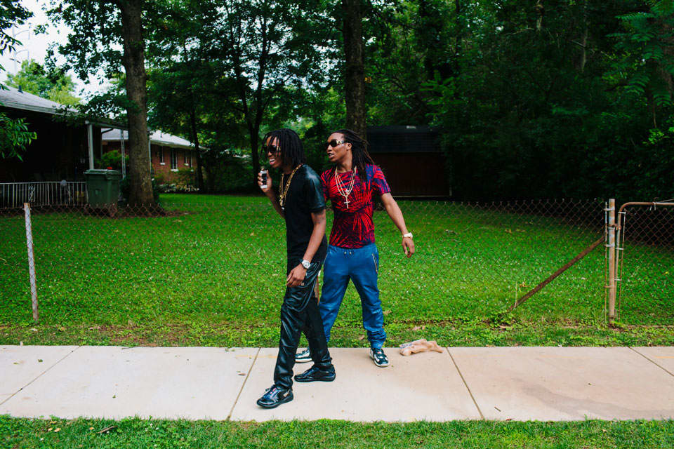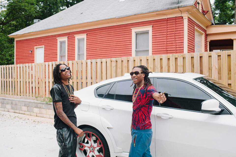 On the afternoon before their June mixtape, Young Rich Niggas, is to be released, two members of the rap trio Migos stand huddled in a hot, windowless studio in southwest Atlanta. They watch the tape’s final mix-down on a screen perched just below a security camera feed offering 16 different perspectives of the building’s exterior. Friends and associates weave in and out of the room, interrupting with last-minute changes to the tape’s artwork and scheduling details for live appearances every night of the week. Trinidad James’ people are waiting on the phone. “I notice the buzz, but you try not to pay attention to it,” says Quavo, 22, the oldest of the group. “Makes you lazy.” His 19-year-old nephew and fellow member, TakeOff, who also wears his long, thin dreads draped over designer shades, smiles and agrees: “It’s a day job and a night job.” Migos’ third member, Offset, is absent, incarcerated midway through the mixtape’s recording for reasons the pair decline to discuss. “He’s ready to get out,” says Quavo. “He’s getting back on the train real soon.”
