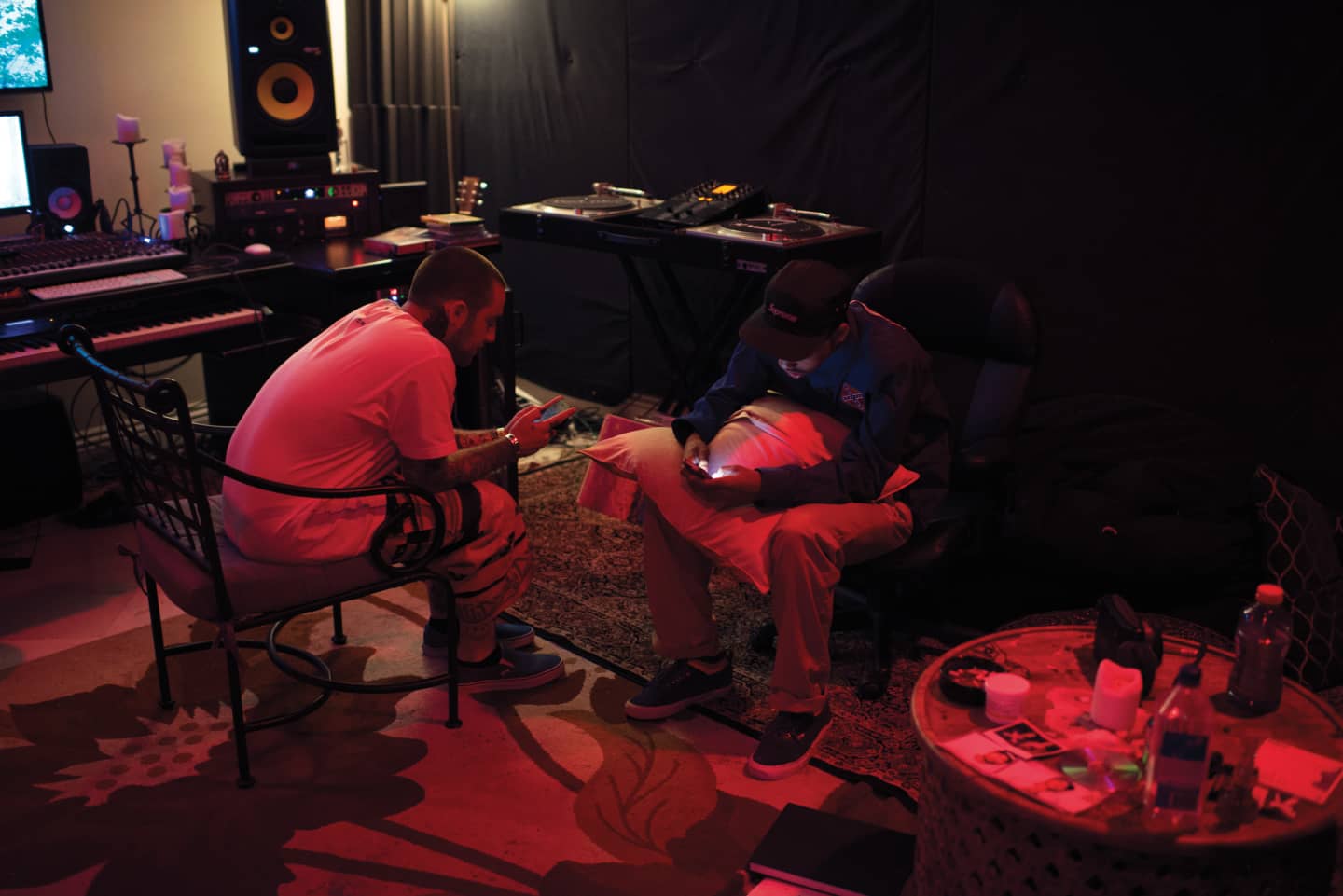 Not Mac, though. He’s already holed back up in the same place he’s spent the better part of the past year—his home studio. The room overlooks Mac’s pool, which overlooks magnificence, but shut the door and the sunlight is completely devoured by the dim glow of red lights. Mac chain smokes menthol American Spirits and sits diligently at the flat-screen monitor in his bare feet. He’s been making his own beats since moving out here, buckling down on what was once just a hobby. Friends rotate in and out, and Mac somehow balances holding court with being completely absorbed by whatever eight-bar loop he’s working on or writing to. In an era when rap producers brag about being able to knock out a beat in mere minutes, Mac spends hours on end, making incredibly minor melodic tweaks or running through soundbanks of crowd noise and farm animal sounds (“This sound is called ‘30 Donkeys?!’”) for appropriate atmospheric flourishes. Blunts are passed perpendicularly to this process, and at any given moment, one of his guests could be prodded to hop in the booth by the ever looming question of, “You got some raps?”