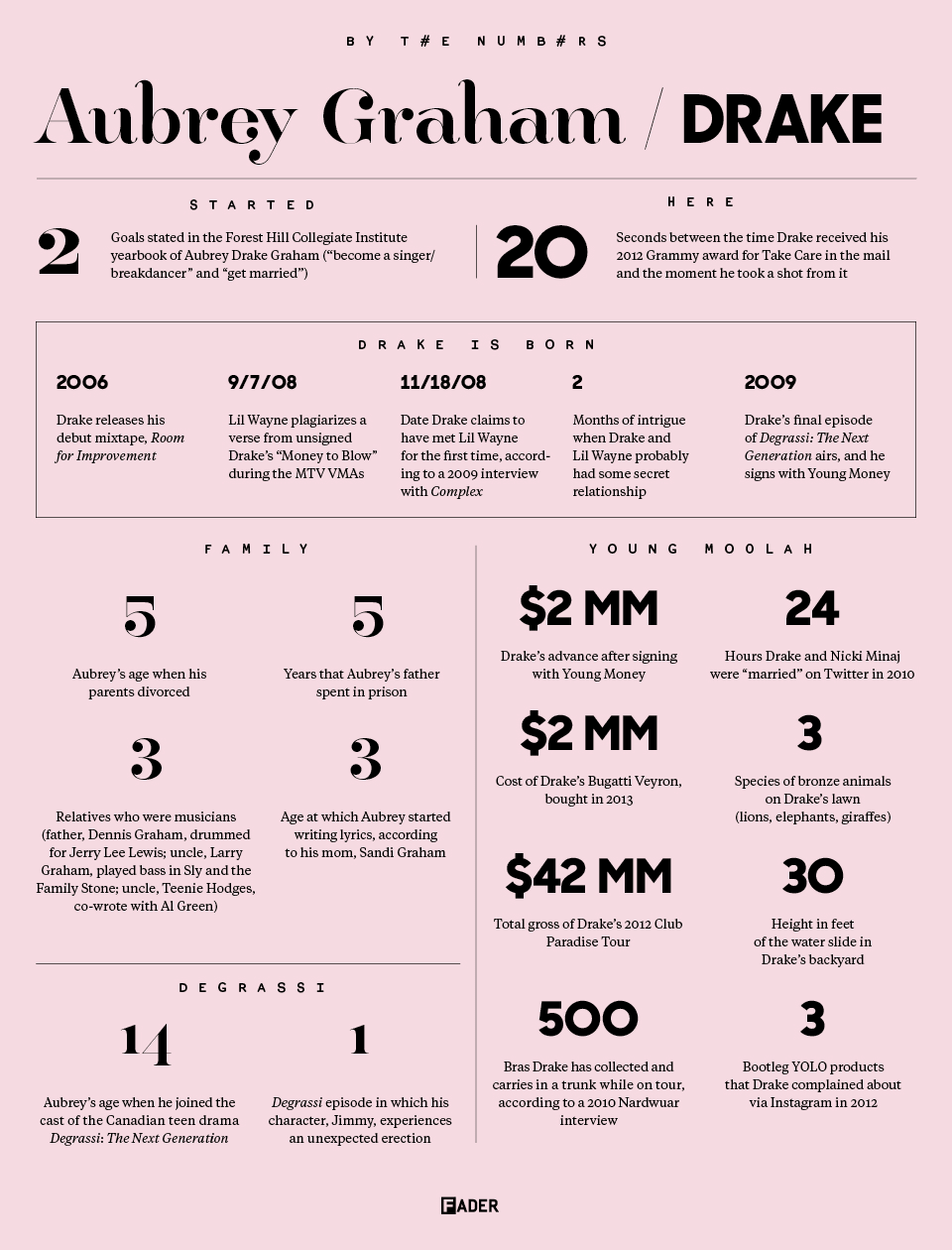 music / Hip-Hop By the Numbers: Aubrey Graham vs. Drake By The FADER Photographer Harry Gassel August 28, 2013 From the magazine: ISSUE 87, August/September 2013 From The Collection: By The Numbers Posted: August 28, 2013 Drake Lil Wayne By The Numbers, Drake, Hip-Hop, Lil Wayne Read full story