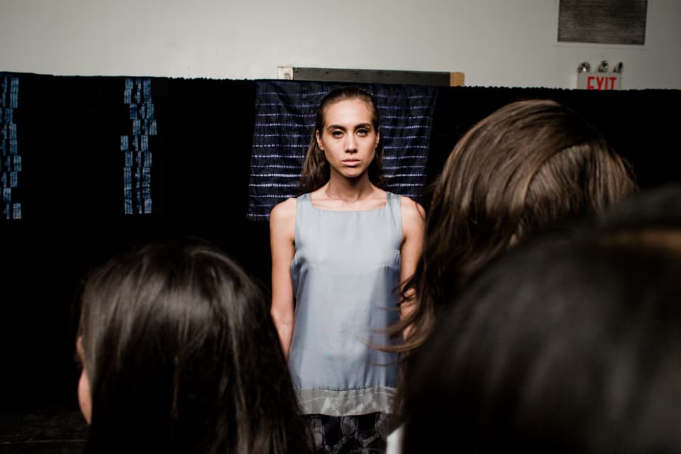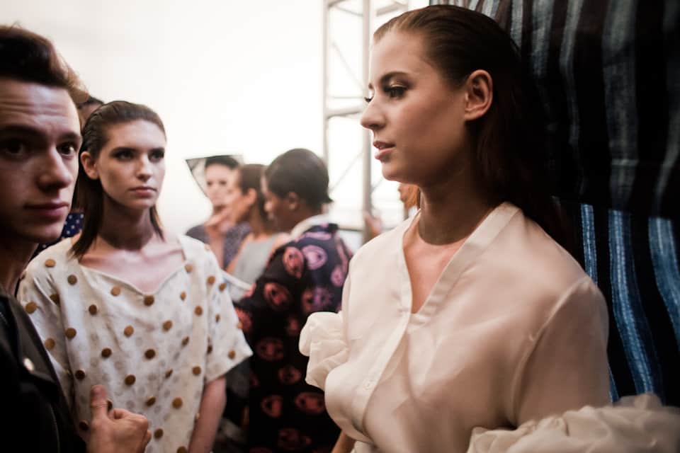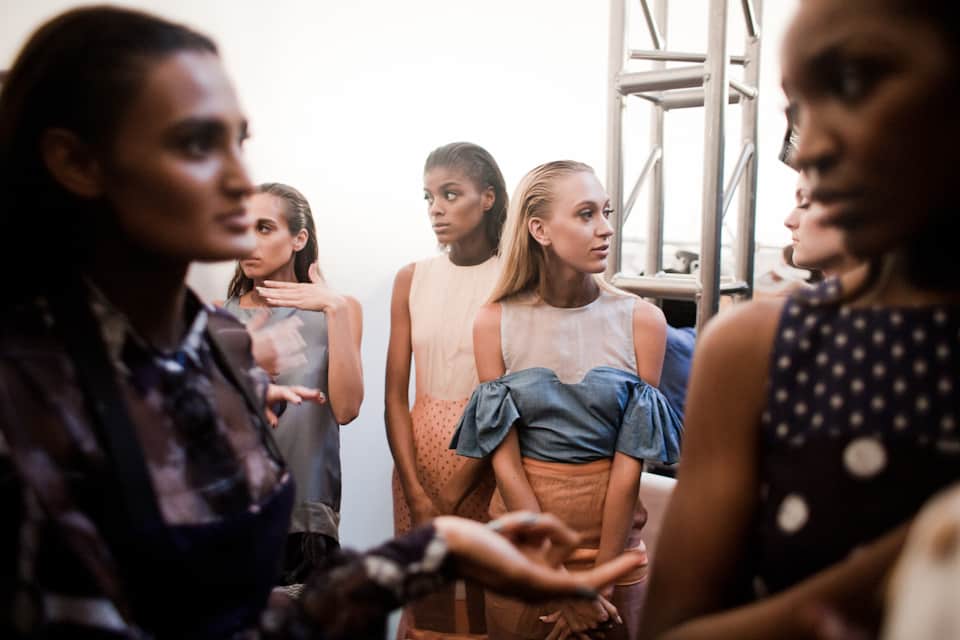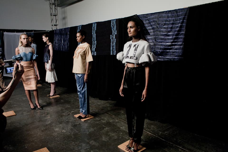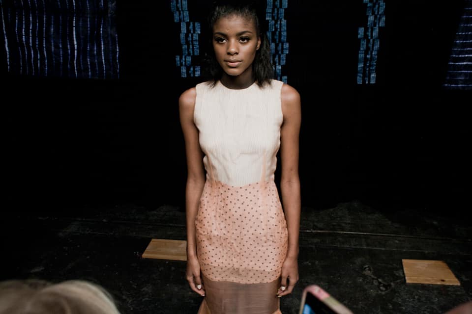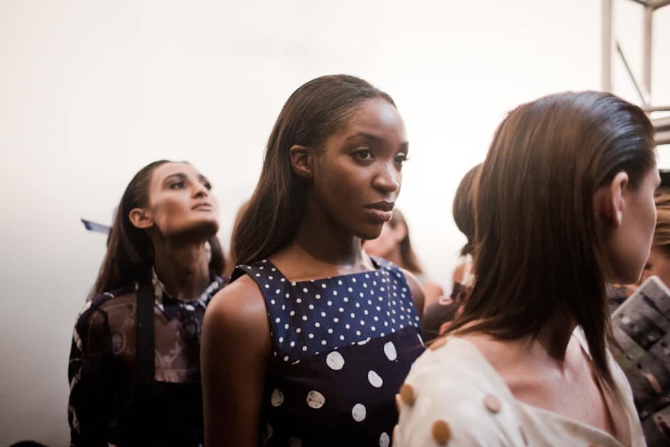 Sure, it’s great to look at clothes on the runway, but the true fun and hard work of New York Fashion Week goes on backstage, with designers, stylists, models and makeup artists running around to make everything on the stage seem effortless and easy. Nigeria-based designer Amaka Osakwe, with her line Maki Oh, presented a graceful collection that brought together football jerseys and fluffy chiffon. Backstage, we captured models receiving spray-on neck tans and polka-dot manicures, with hair by Free Your Mane and makeup by TEMPTU.