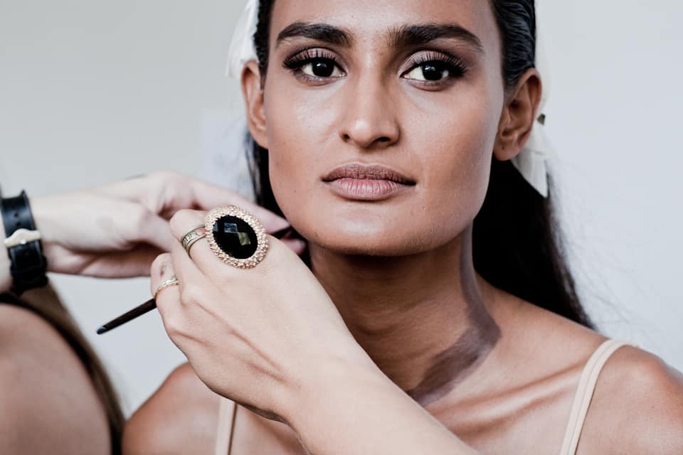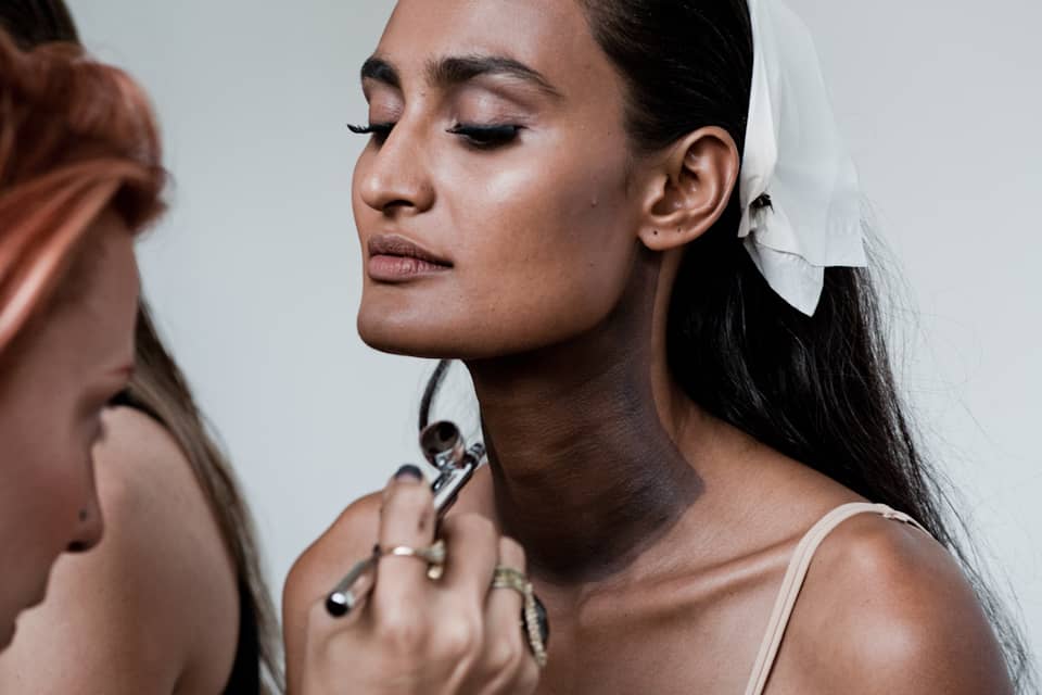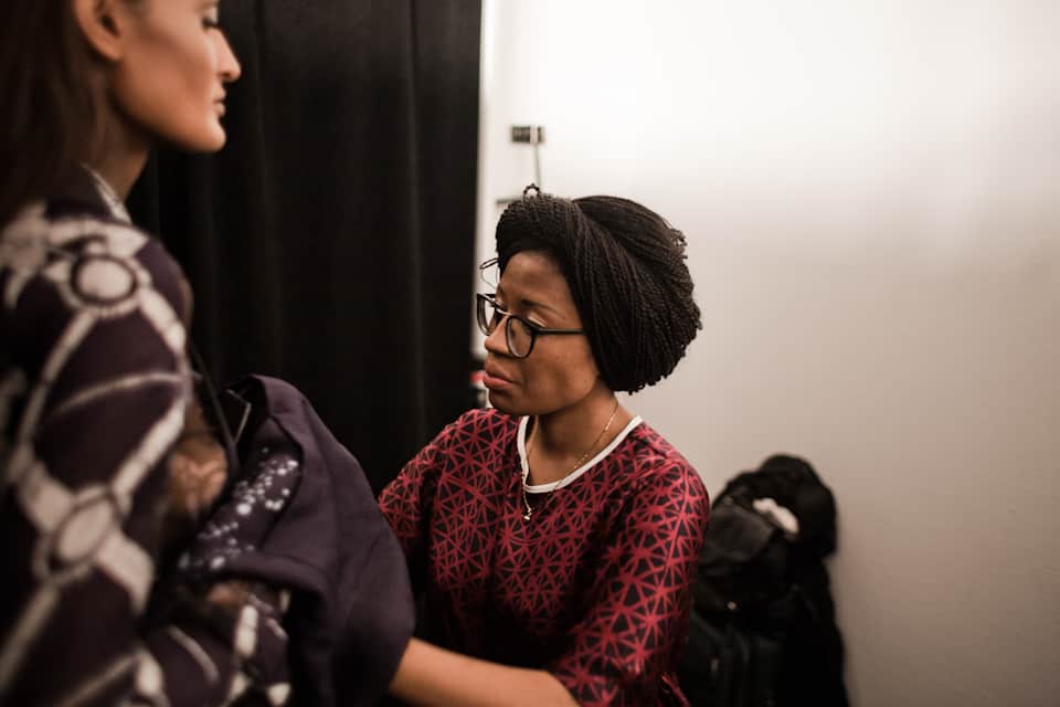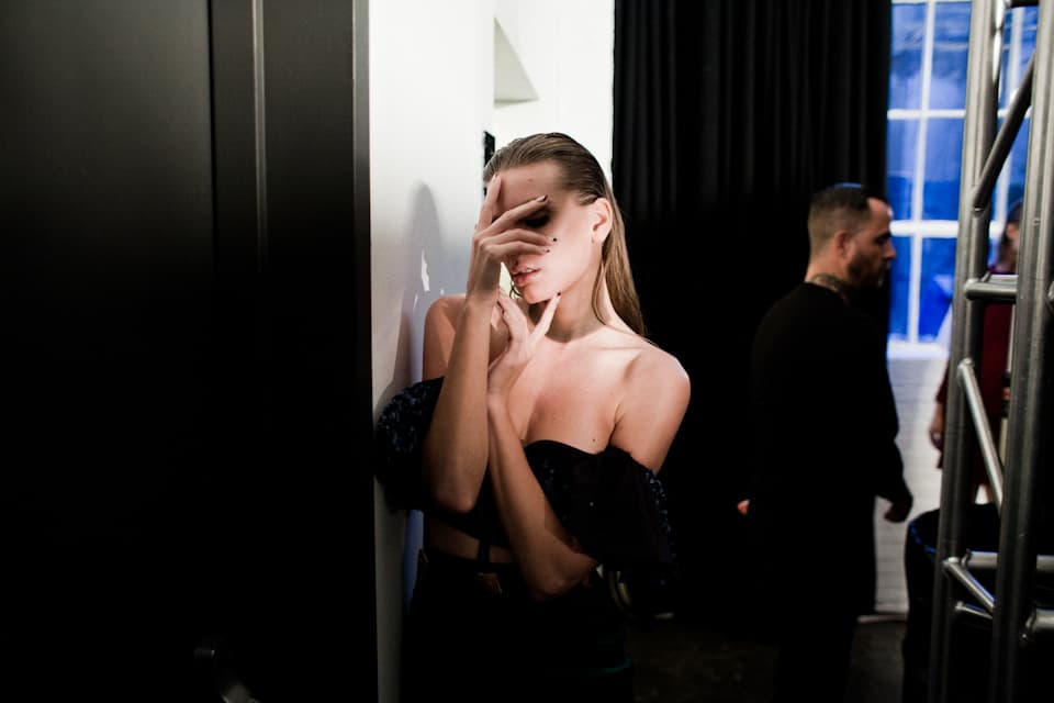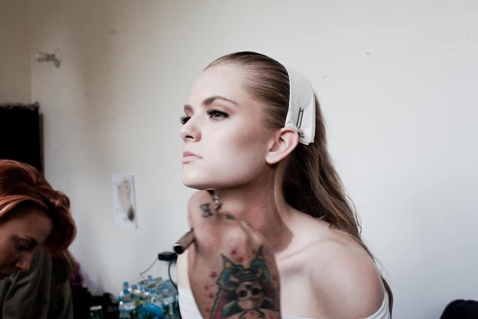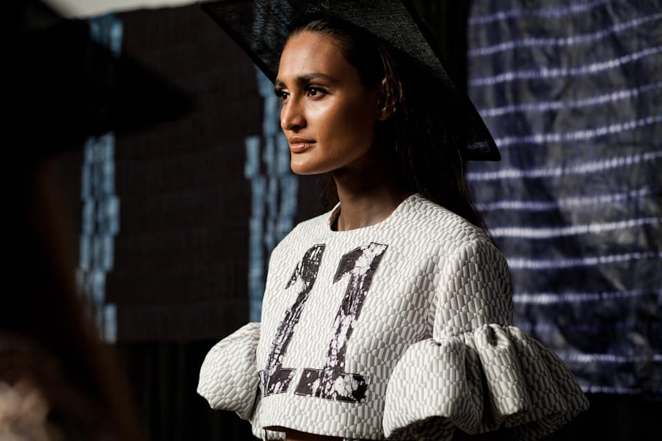 Sure, it’s great to look at clothes on the runway, but the true fun and hard work of New York Fashion Week goes on backstage, with designers, stylists, models and makeup artists running around to make everything on the stage seem effortless and easy. Nigeria-based designer Amaka Osakwe, with her line Maki Oh, presented a graceful collection that brought together football jerseys and fluffy chiffon. Backstage, we captured models receiving spray-on neck tans and polka-dot manicures, with hair by Free Your Mane and makeup by TEMPTU.