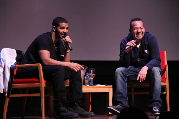 There were facts dropped, too. A video for "Hold On We're Going Home" will be released this week. Jay-Z's "Pound Cake" verses were intended for Magna Carta Holy Grail and given over to Drake as a favor. Wu-Tang's Cappadonna did the ad-lib on "Wu Tang Forever." These revelations, though, were less interesting than watching Drake be Drake. He talked like he was several steps ahead of everyone, called himself "the guy with the clouds in the background," and made a Matisyahu joke. Apropos of nothing, he exclaimed, "Fuck everybody, man!" He subtly teased Wilson, like a comic or politician might. When Wilson talked about hanging out in barbershops, Drake clowned: "The barbershop? You don't get that haircut at the barbershop. You get that at the salon. The barbershop, that was just like, the most hip-hop thing you could say."