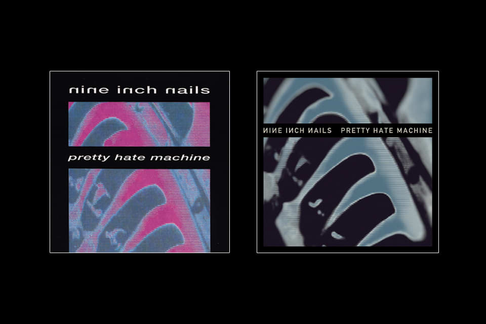 The original Pretty Hate Machine packaging (1989) was built around a photograph of a microphone, colorized in an early-digital, mock-psychedelic, Photoshop line-screen. Comp-lementing the image was the of-its-time use of entirely lowercase lettering—typography that was further distinguished by four instances of the backwards letter “n” in the band’s name. This simple reversal, an echo of the 1980 Talking Heads record Remain in Light (which vertically mirrored the two “A” characters in the band’s name, and was made by the legendary designer Tibor Kalman at M&Co), has since become a staple of the NIN graphic identity. The 2010 remaster, designed by NIN creative director Rob Sheridan, who dropped out of Pratt in 1999 and has since become the unofficial second member of the b(r)and, normalized the color of the original and set the title in all-caps in the typeface DIN. It was a debatable improvement; its effect is sort of like putting an unobjectionable necktie over an endearingly shitty, hand-studded jacket.
