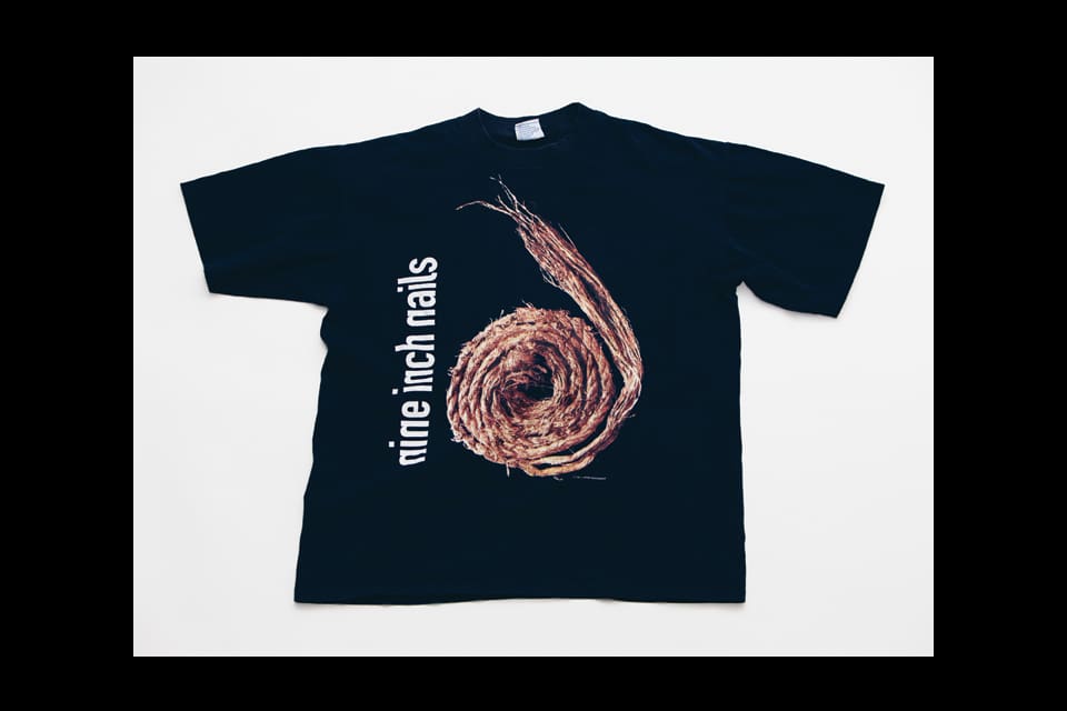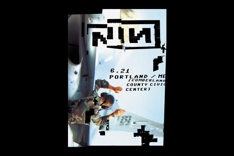 Much like the image of a spiral, but even easier employed, the brilliance of Pretty Hate Machine’s reversed “n” characters was that the masses could make them. Producing a convincing bootleg of a NIN T-shirt, bumper sticker or handbill was simple as could be—all one needed to do was find a way to render type, and then reverse all the instances of the letter “n.” With just that gesture, even the most commonplace of chartreuse Xerox prints—like this radio station’s simple flyer for a ’95 concert in New Orleans, which also employs overlaid splotches of The Downward Spiral’s cover art—appear as though they came directly from the band’s hand. No matter the font, no matter the substrate, no matter the accompanying imagery, this was a graphic identity that was infinitely reproducible—democratic, populist, egalitarian. A demonstration of affiliation with the band and its output was free and available to all.