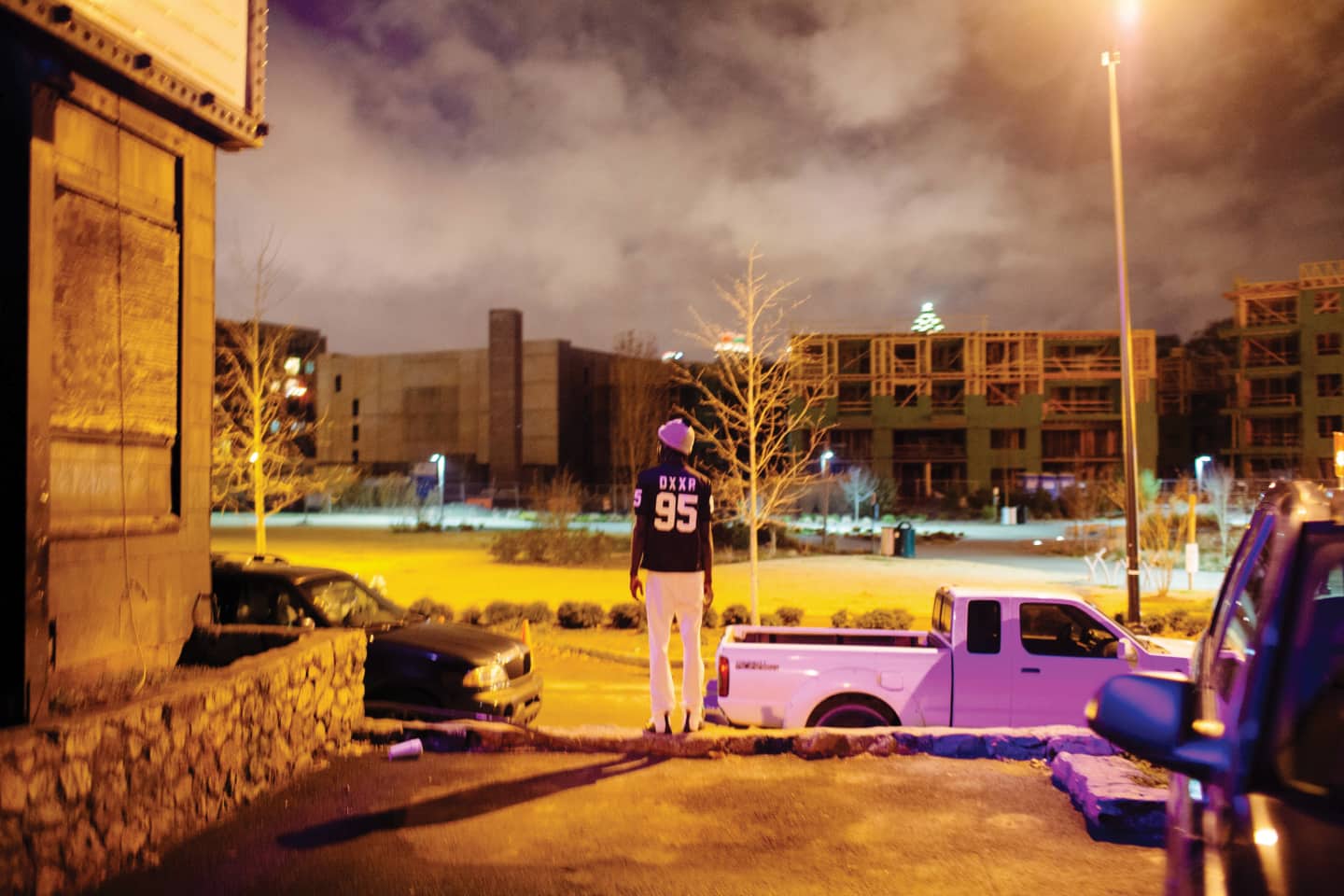 There’s a knock at the back door and everyone scowls and glares, and two guys in the kitchen pick up their pistols and peer out through the room’s only sliver of exposed glass. A third waits off to the side, by the stove, clutching a black and brown semi-automatic. No worries though—it’s just the guy with the snacks. The guns are put away and the guy with the snacks tosses three bags of gas station food on the floor. Thug tears into a bag of Funyons. Then the beat starts over, Peewee starts racking up the balls and the blunt recirculates, the room once again filling up with smoke.