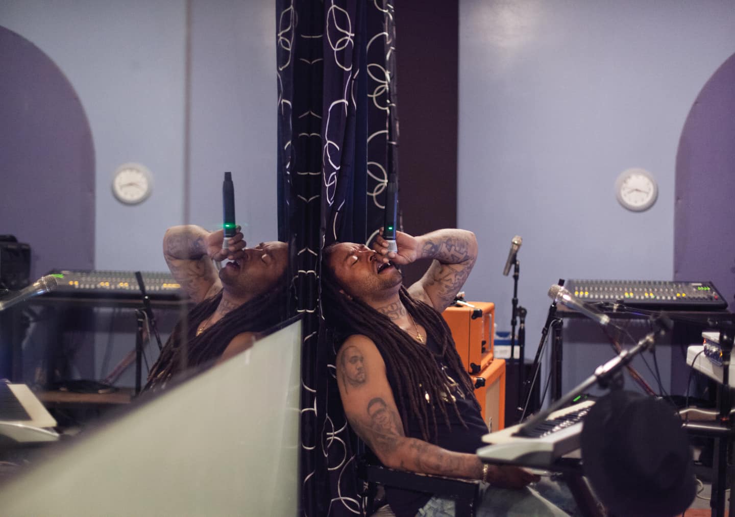 Mid-puff, Ty comes in from the cabana and starts tapping out a beat on an MPC, occasionally riffing on an acoustic guitar. It’s a banger, and in under an hour, it’s close to finished. Ty keeps a small studio in the corner of the living room, and he’s made some of his biggest hits—“My Cabana,” “Float,” “Ratchet in My Benz”—exactly like this: weeded up and vibing off the dank and torrid California air. Ty’s computer and a handful of synths are flanked by a record collection deep with ’90s and ’00s underground hip-hop, and he sits beneath a framed copy of Sa-Ra Creative Partners’ 2007 debut, The Hollywood Recordings, on which he’s featured twice. His workspace is tiny, but he prefers it to professional studios, rearranging his set-up every so often for a change of scene. “Paranoid,” he says, was written with his back to the wall, synths facing the door. He’s deeply inspired by his Los Angeles surroundings; humid sub-bass sounds great with a view like his, palm trees poking up across the landscape, and even better when you’re speeding down the freeway in his BMW SUV, accelerating to the tempo and letting the breeze hit the kicks.