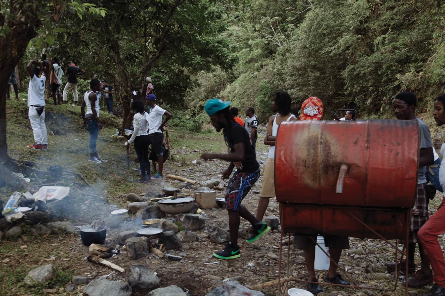 After turning onto a narrow and rocky dirt road up inna de bush to an area known as Sunning Hill (or maybe it’s Sunny Hill—in Jamaica, place names and spellings are sometimes fluid), we finally arrive at the banks of the Roaring River, a somewhat misleadingly named stream where Popcaan’s father, known as Shaggy, and a few other relatives have set up grills along the shore, preparing jerk and curry chicken. By late afternoon, the crowd has swelled to about 50 people: cousins and other extended family, Kingston friends and curious local youths who’ve ridden up the hill on bikes.