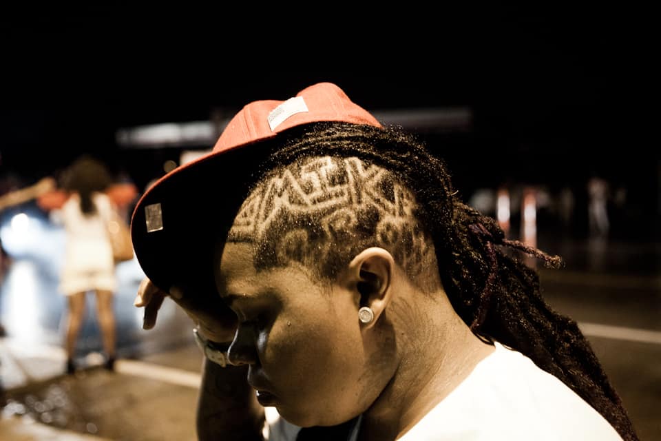 • Akay Tomboy, a hip-hop artist, shows off Mike Brown's name shaved into the side of her head. That night, Tomboy, who said she lives across the street from "Ground Zero" wore a replica outfit of the one that Brown had on when he was killed.