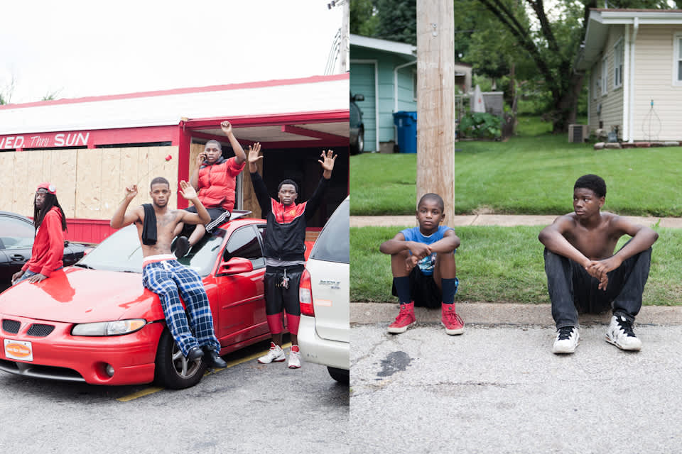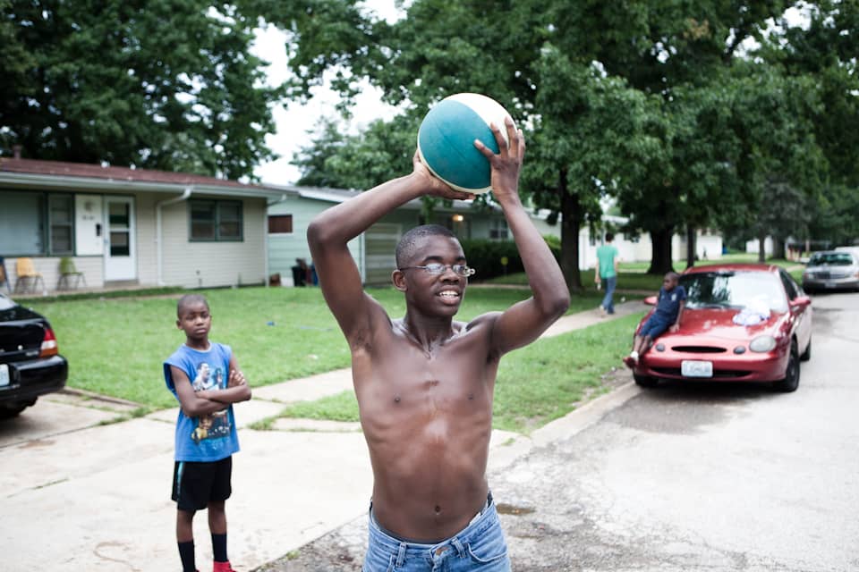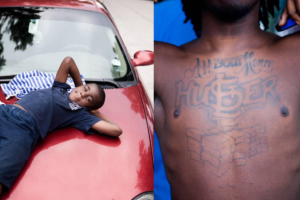 • RIGHT: A young boy rests on the hood of his car and watches a basketball game on Ellison Drive, just a block away from the protests on West Florissant Avenue in Ferguson on Saturday. LEFT: 'Polo' shows off his 'All Bout Money' tattoo outside of a grocery store in Ferguson. "This shit is messed up, and he's gonna get away with it. Cops out here mess with us for no reason, and at this point, we don't want a relationship with police."