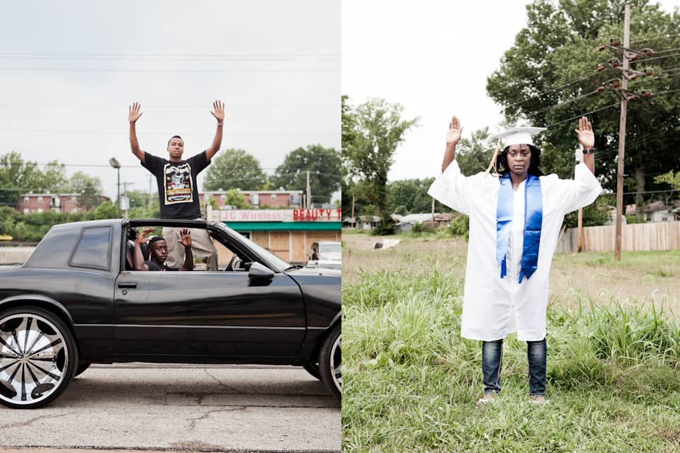• LEFT: 'CB' (top) and 'St. Louis Boosie' (bottom) in a Monte Carlo on West Florissant Avenue in Ferguson. "We have friends who were victims of police brutality," said CB. "We know how (police) get down, so we have to stick together. We have a right and our own authority to be out here protesting." RIGHT: Barbara Brown-Buress stands in a field on West Florissant Avenue dressed in her graduation gown on Friday. Her nursing school cancelled their graduation that day in wake of the unrest in Ferguson, but Brown-Buress said she was proud to stand with the protestors.