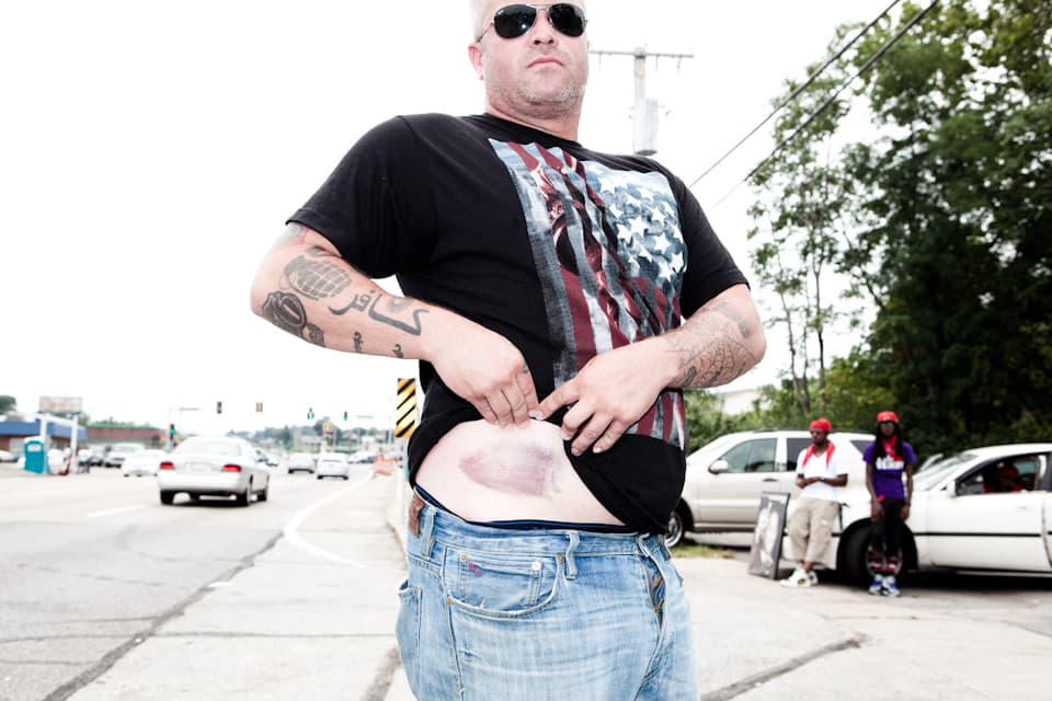 • Joe Biggs, a journalist for Infowars.com, shows where he was hit with a rubber bullet shot by police the night before.