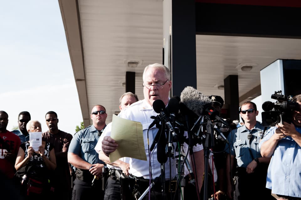 • Missouri Highway Patrol Captain Ron Johnson, a Ferguson Native, speaks to the press after being put in control of public safety on West Florissant Avenue on Friday afternoon.
