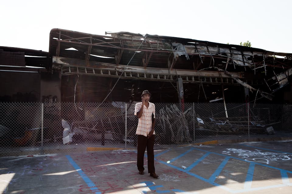 • A man in front of the burned remains of the Quik Stop on West Florissant Avenue.