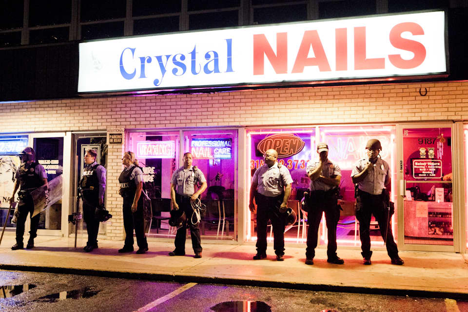 • Riot police guard the businesses on West Florissant on Saturday after looting the night before.