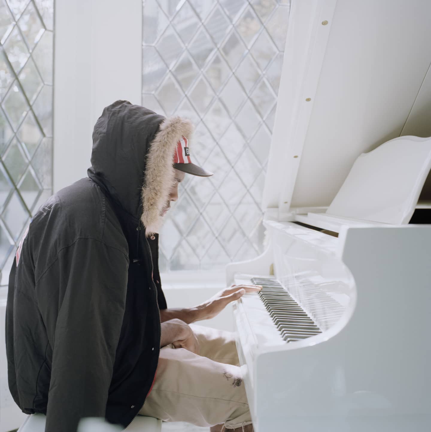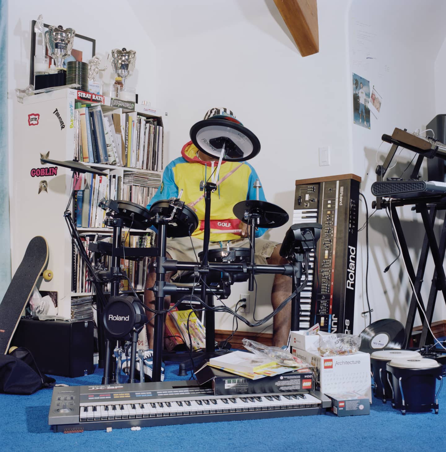 Tyler's friends—Lionel Boyce, Matt Castellanos, and Cameron Lee—who work with him as writers for Loiter Squad, are crammed on the oversized bean bag, trading turns on an immersive street-racing simulator called Forza that's projected onto a large white wall from an Xbox 360. A few feet away, Tyler is loosely strumming a newly purchased electric guitar. Look into the sky/ If you see yourself, then you could fly, he sings, over and over again. Soon, Lionel tires of racing and chucks a controller Tyler's way. Selecting a green roadster, Tyler dives into the game while still mulling over the line he's been singing. When a melody he likes emerges from the riffing, he runs back to his keyboard to lay down some horn sounds. "That shit sound tight, T," Lionel comments, to no reply—Tyler is already back to his race, in third place and gunning for first.
