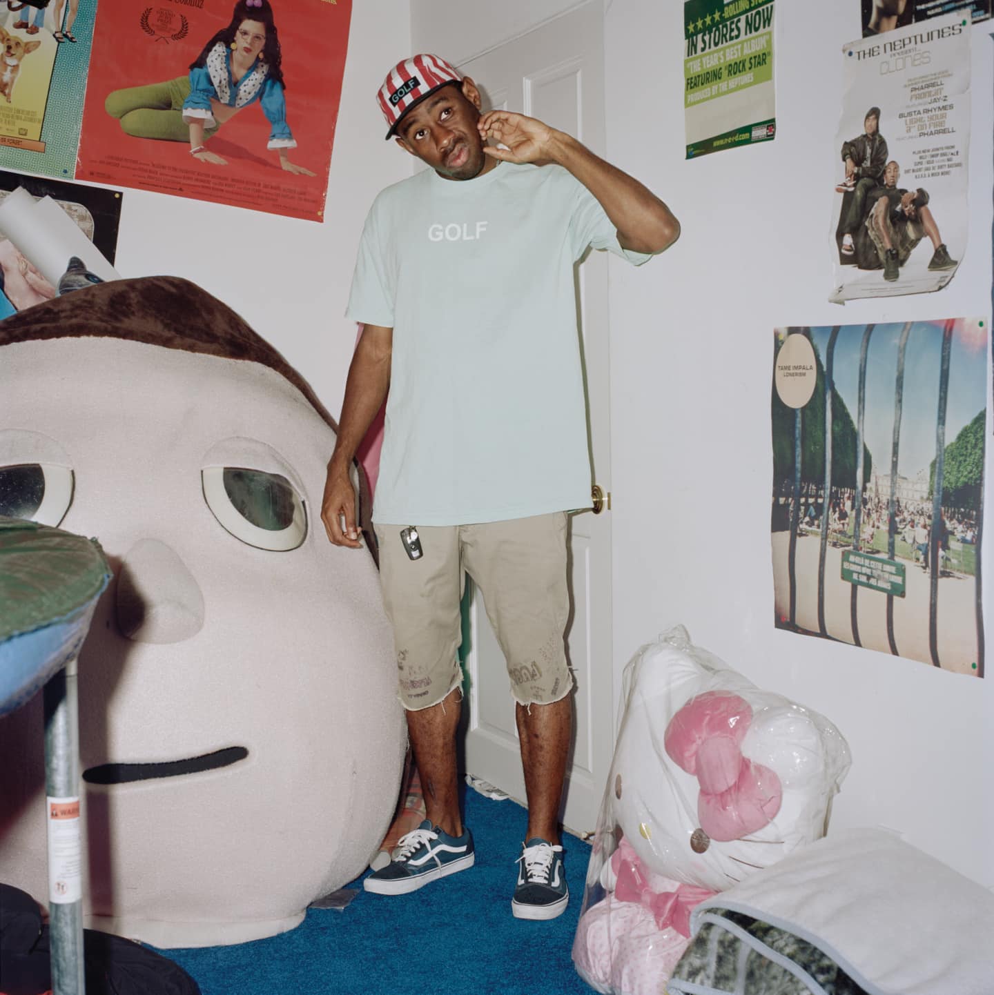 After our near-death experience, Tyler and I spend most of Sunday afternoon hanging around in his bedroom. It's massive, with towering attic ceilings and wall-to-wall royal blue carpeting, and it's mostly unfurnished, aside from a bed, a bean bag chair, and a giant trampoline he planned to buy for years and sleeps on sometimes. Lego sets are scattered across the floor, assembled into elaborate models for buildings that Tyler wants to construct. Posters of Pharrell, Eminem, Erykah Badu, Madlib, Kenan & Kel, and Napoleon Dynamite line the walls, calling back to the early '00s, an age when synth weirdos like The Neptunes and Timbaland pointed to a new sonic future for a genre addicted to funk samples from the past. Tyler has pillaged the baroque sounds of that era throughout his career, though his music doesn't adhere to any one aesthetic, other than his own. As a producer, he's gifted at articulating the specific attitudes and emotions of his brand—there's the childlike nostalgia of "Bimmer," the combative chaos of "Tamale," the slapstick parody of "Bitch Suck Dick," all jingles as much as singles. This ability to distill feeling into items for profit bleeds over into his clothing designs, bubblegum color blocks that could outfit a gang of protagonists from any classic Saturday morning cartoon. It's no wonder the two strands of output are inseparable in his mind: "Songs I listen to in the morning dictate what I wear," he explains at one point, with a draft of a new beat on loop. "This sounds like a red and white striped shirt."