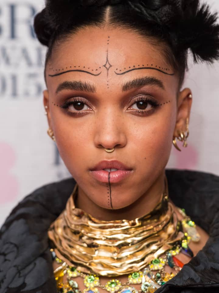 In addition to straight slaying her live performance at last night's BRIT Awards Nomination Launch, FKA Twigs turned in a brand new look: temporary face tattoos. The one-time FADER cover star ditched her usual swirls of baby hair and bondage-ready braids in favor of a pulled back hairdo, all the better to highlight the tats' elegant dots and swirls. Paired with a black dress from Parisian label Aganovich and a neck full of jewels by Annelise Michelson, this red carpet look was nothing short of regal.