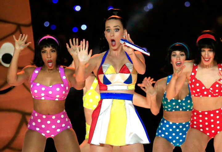Whether you're rooting for the Seahawks or the Patriots, the real winner tonight is clearly Jeremy Scott, who designed each of Katy Perry's over-the-top looks for the Super Bowl halftime show. Here's a rundown of each themed costume change and the song that inspired it.