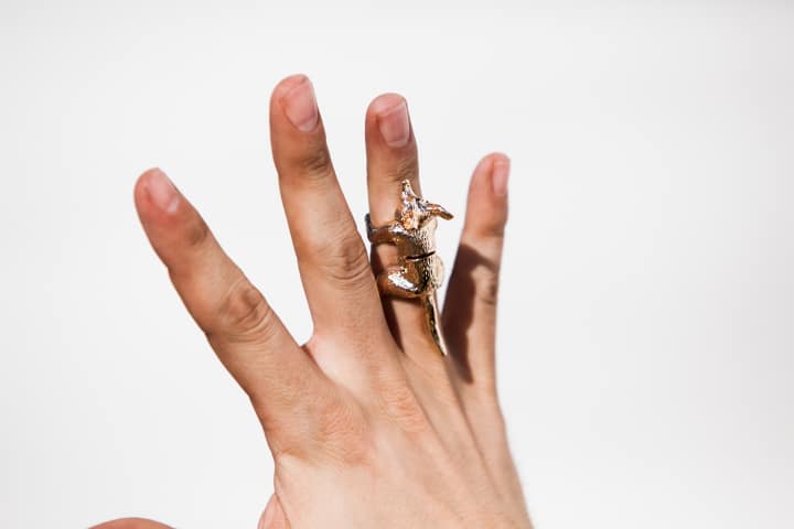 "Peter Cottontale got it for me when we got here. He found a store with all this animal jewelry stuff and said, 'You need this. You have to have this.' It's the epitome of myself right now. It's got the bendy joints. I had another one a while back that was bronze and it kept making my fingers green. But this one I've had on all day. I don't wear a lot of jewelry, maybe a necklace, nothing crazy, very selective pieces. From now on, I'll wear this to every show we have—but only because it's that hot—and because Peter gave it to me."