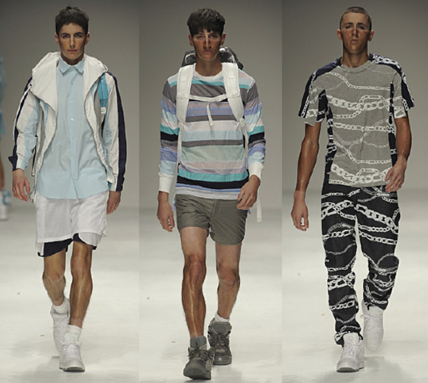 Both JW Anderson and Christopher Shannon had sportswear on the brain this season, but it's interesting to see where the two designers ended up with that sporty train of thought. Anderson studied basketball uniforms from the 1970s and tribal warriors—couple this research with a penchant for womenswear, and what your left with is streetballing swagger spliced with Maasai-appropriate flourishes: miniskirts for men and the kind of beaded kilts Marc Jacobs might be really partial too. Shannon on the hand had a chance to show off a couple of new collaborations he's been working on (namely Reebok and Eastpak) layering the oversized backpacks and fanny packs on models with colorblocked tanlines.