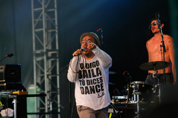 We took our first trip of the day to Latino Alternativo, a showcase for Latin American acts. It's a relief that the festival curated something as tricky and loaded as a "Latin American" stage without reducing it to anything obvious or limited, and we saw Colombia's Bomba Estereo and the Mexican Institute of Sound right after each other in the noon-time sun. They were both a jolt of caffeine, energetic without insanity.