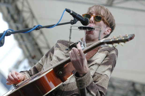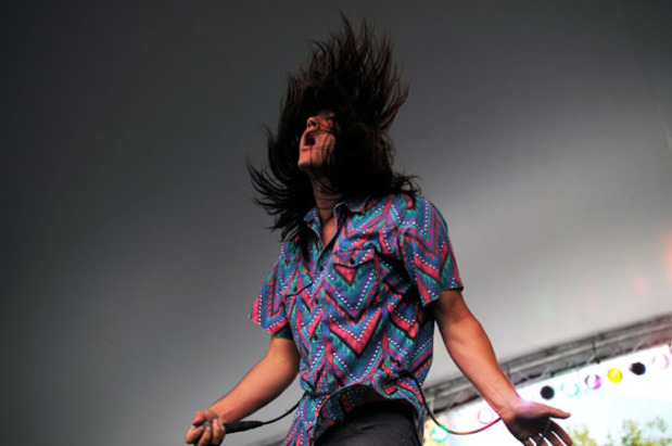 Following that, it was a brief walk past some little kid rides (shout out to the tiny roller coaster!) to see Atlas Sound. In the past, we've never known what to expect with Atlas Sound. We've seen Bradford Cox perform completely solo and unadorned and we've seen him perform with High Places on extra instruments. Both times, the shows lacked the beautiful atmospherics of the Atlas Sound albums and the energy of Bradford's main Deerhunter project. Here, though, he was in his element and completely alone with a guitar, a loop pedal or two and a harmonica. People lounged around in the grass and Cox slowly played his way through a well paced set that we could have napped to (in a good way!), had we not been so captivated by the way he evoked Neil Young without actually sounding like Neil Young. Maybe it was the way the set was rough without sounding poorly planned or unrehearsed, but it also could have just been his smooth falsetto and harmonica, floating over the looped guitar haze.