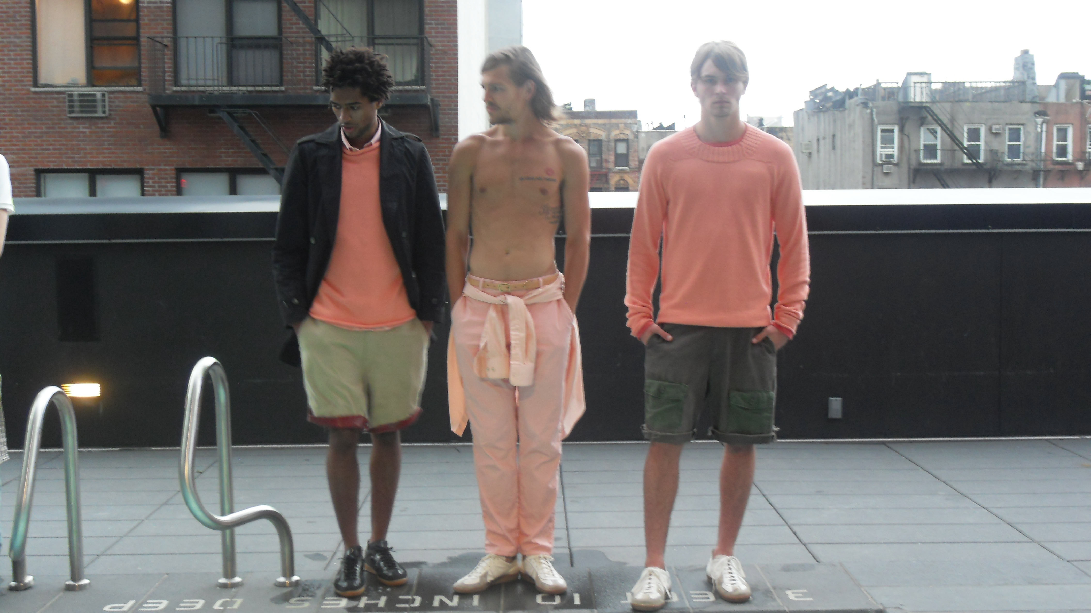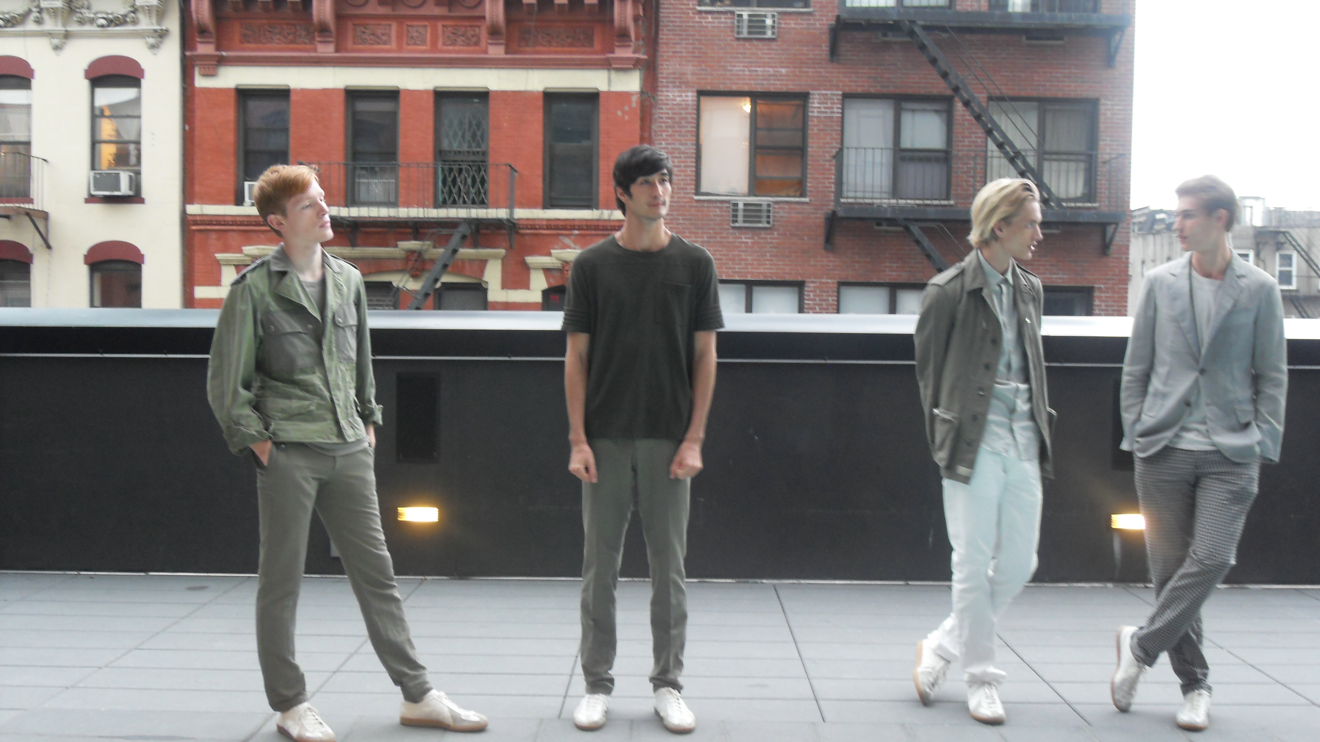 Torrential downpours did not stop George McCracken's Spring 2011 presentation at the Thompson L.E.S. on Thursday. The models acted like decorative borders around the pool, and three guys stood floating on top of the water on mini-barges, helpless to the damning storm that was about to hit. That didn't worry the McCracken team too much though. They ever so casually offered the idle models wood planks to guide them from the water back onto safe dry land. The storm made things better, in the end: As the models were relocated to the bar, everyone could see the collection up close, noting McCracken's comfortable fit for each piece. Relaxed separates like denim jackets were paired with trousers and cargo pants, button-ups and accented sweaters. Four seasons in, it seems that George McCracken is crystal clear about the chill vibes of who he is dressing and what they expect from him. More looks after the jump.