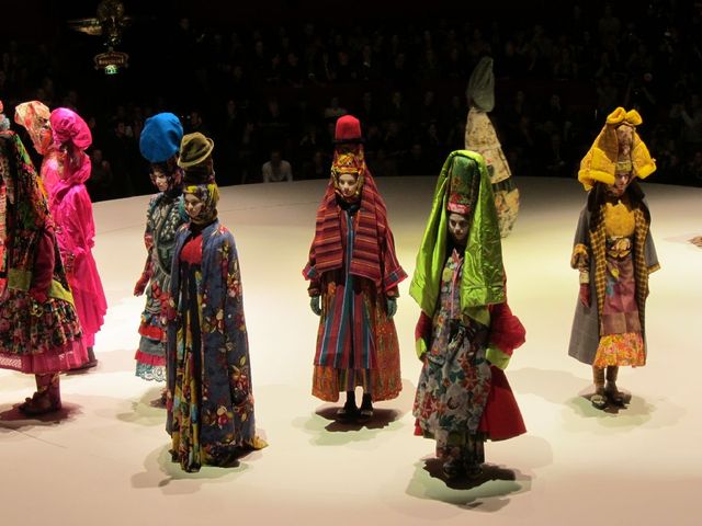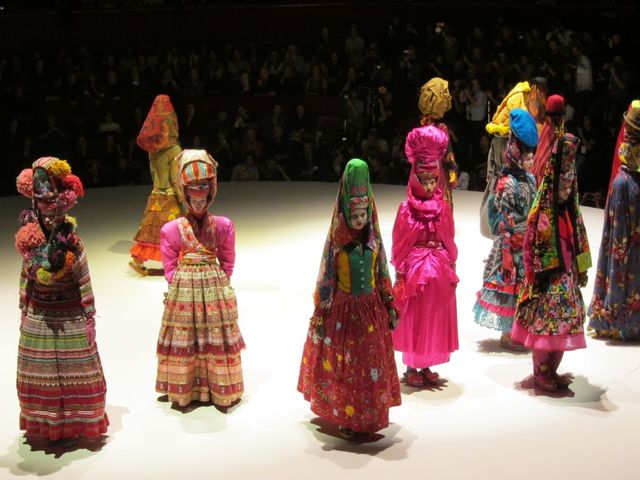 Like some high fashion, bizarro world version of the American Girl doll store, Kenzo's unleashed a crazy assortment of looks, one for every type of girl, to celebrate its 40th year on the runway. Shown at the tail-end of their latest show, designers Vanessa Reid and Antonio Marras went bananas pinning, tucking, and wrapping what seems like miles of fabric to showcase just how versatile and interesting Kenzo's history has been. The two designers pulled from a wide array of cultural sources: we spot looks inspired by West African masquerades, Japanese Kimonos, Russian Matryoshka dolls, traditional Dutch wear, and maybe even a few nods to Natalie Portman's home planet in Star Wars: The Phantom Menace. More after the jump. (via Style Bubble)