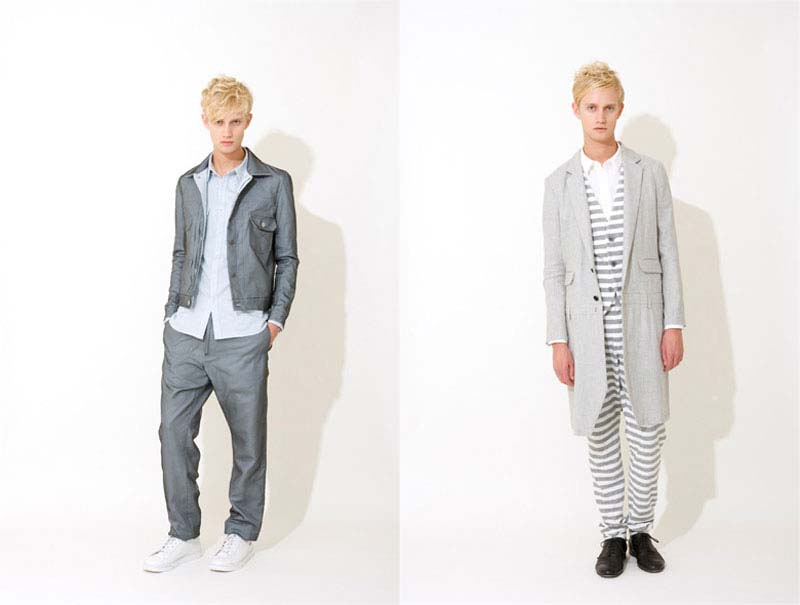 Unusual cuts, quirky details and stripes galore are the trademarks of Ethosens' Spring 2011 lookbook. Designer Yui Hashimoto turned a simple scheme of solid navy, grey, black and white into an intricate collection of shirts, pants, ties and even onesies. We're geeked over his take on the mullet of menswear —business suit in the front and a sweatsuit in the back. Business casual indeed! Check after the jump for more images. (Via SlamxHype)
