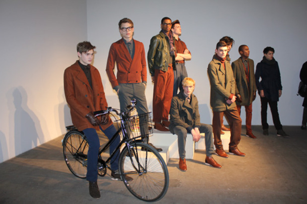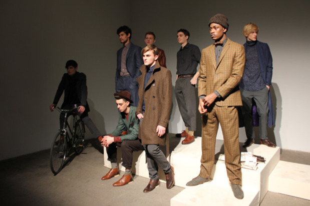 Carlos Campos took us back in time with his latest menswear collection at Exit Art over the weekend. The Oliver Twist newspaper boy showcase triggered a nostalgic feel with vintage bikes and cigars. An earth tone palette and rustic colors were perfectly autumn inspired. Campos displayed wool suits in different colors and patterns, long jackets, pleated pants with braided belts and button-ups that were ready to wear for the everyday. Jackets were structured but not too tight or constricting, the bowties and suspenders added some humor and cognac lace-up shoes and oxfords tied everything together, making each piece effortlessly cohesive. Check out more images after the jump.