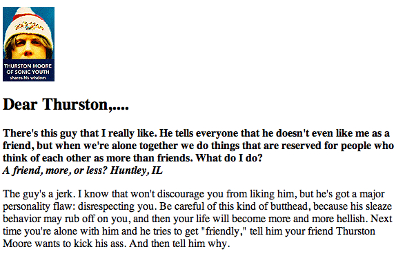 We first fell in love Thurston Moore when a friend showed us a Sassy Magazine love advice column he'd done for teenage girls. Now, after a slight lull on his blog the Sonic Youth man is back at talking to the people — he's posted about hanging with Kurt Cobain, put up pictures of him, wifey Kim Gordon and J Mascis at an outdoor snow barren noise jam and written a compelling review of seeing Sid Vicious live in '78 [excerpt: 'After the first song some girl yelled "I love you" to which Sid retorted "Shut yr fucking mouth, you stupid fucking cunt!".' ] Also, Sonic Youth have recently released an instrumental soundtrack to director Fabrice Gobert's Simon Werner a Disparu on SYR Recordings. Stream the new joint over at Midheaven. See the original Sassy advice, after the jump!