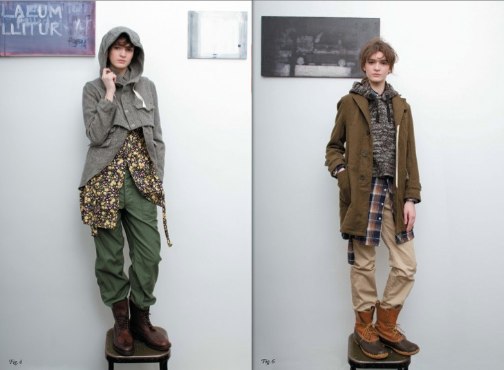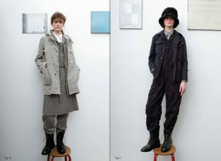 In only their second season of designing womenswear, this fall finds Engineered Garments artfully over-dressing ladies in deconstructed suiting and swathes of quilted nylon. Oddball layering subverts what could've been run of the mill heritage wardrobe pieces; the magic is in the mixing. Worlds collide when a polka dot blazer is worn under a cropped anorak hood. It feels a tad radical to place a reversible kilt on a woman.