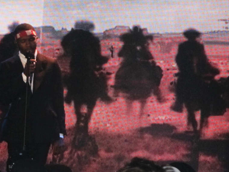 This summer, Ocean released a demo of a song he’d written for someone else on his Tumblr. Then he quickly took it down. But it was too late, the song “Thinking About You,” otherwise known as “Thinking About Forever” by Bridget Kelly, arguably became his most popular, and potentially best, song. Kelly’s version is essentially a full-fledged follow through of Ocean’s, the backing boosted and her vocal performance better recorded and mastered—just all around bigger. But Ocean’s tossed-off version is just better. It isn’t trying, even if he is. Ocean, of his own admittance, is a heavy perfectionist, and his hard work shows. (This isn’t a dig.) Live, “Thinking About You” sounded sweet and light, as though, as hard as he might try, the song could never be laborious. Ocean’s songs, as perfect as many may be, with their many samples and in-jokes, often feel like projects as much as they do songs. Further to that point: Ocean sang in front of a screen projecting mostly scenes of movies; one song was accompanied by a montage of people jumping from buildings (was that The Hudsucker Proxy?!), another was a series of clips of Clint Eastwood. He ended his set with the world ending, as seen from outer space.