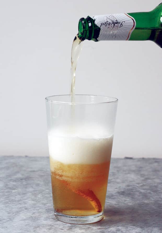 This is inspired by a favorite party drink from college. We would pop open a Budweiser and shake it up with a packet of Kool-Aid. This is a bit more elegant than our dorm room version, but it’s the same basic idea of mixing sweetness with starch.