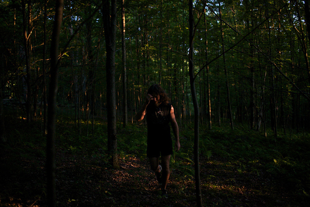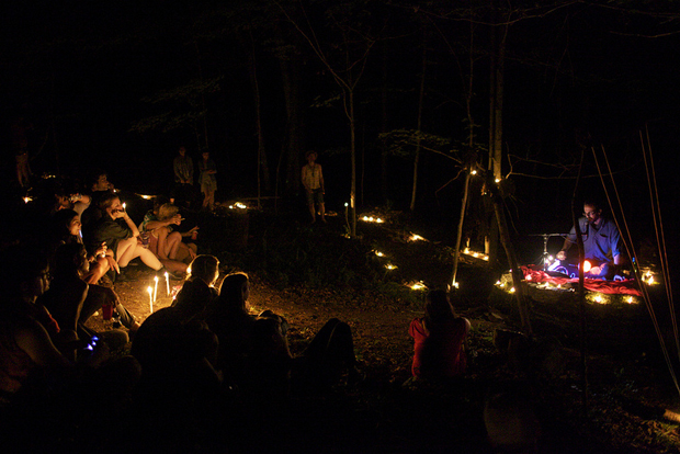 After the bands, a flower-garlanded bonfire taller than the trees went off and the hand-painted #forestparty sign went with it. Behind the fire, back in the woods, New Villlager croon-king Ben Bromley lead a primitive drone hour in a clearing decked out in Andy Goldsworthy-inspired stone stacks and moss hangs. Bromley sat cross-legged on a stone altar at the center and called the whole scene a vortex, but you would've thought more of church or the TV show Ancient Aliens.