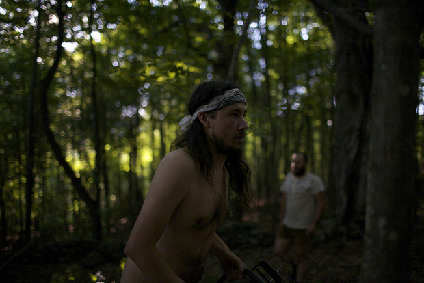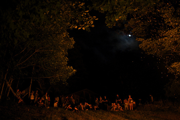 Thursday, before anyone arrived, we built benches into the trees, I mean drilling right into the trunks. It looked like an Ewok village at the end. McBean himself spent half the next day hunched over a shell of a stage, securing straight new boards to the frame, while humble folk-viber Castle broke fire sticks in the woods and Nicolaus ran scales on a beautiful hollow-body guitar 20 trees down to the left.