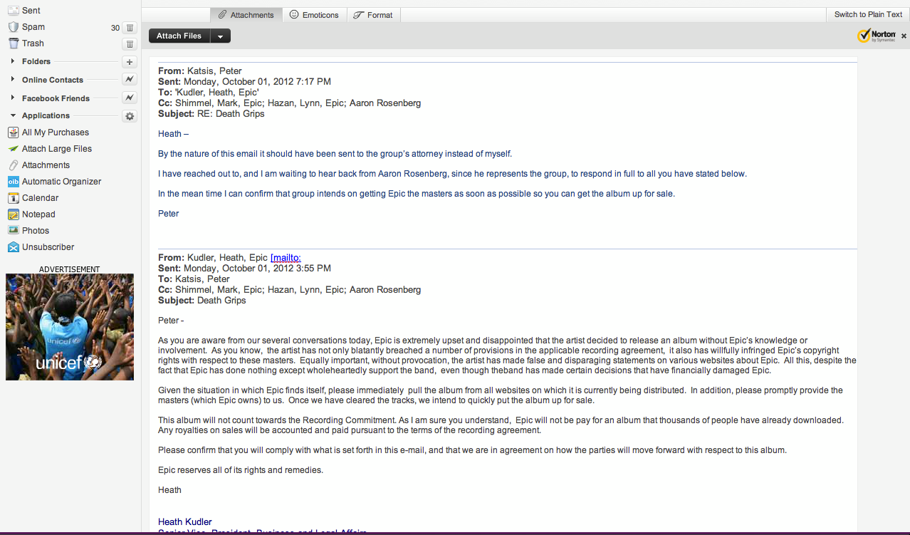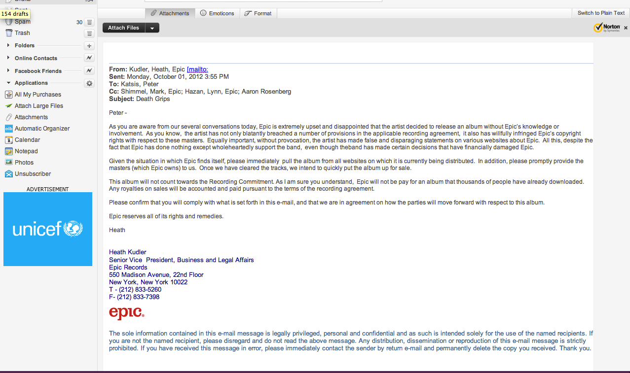 Though rap group Death Grips are signed to Epic Records, early this month they released a record online for free, No Love Deep Web. It had a picture of a penis on on the cover. Epic was not happy about this for multiple reasons, and an email just posted to Death Grips' Facebook page from the label confirm this. "As you are aware from our several conversations today, Epic is extremely upset and disappointed that the artist decided to release an album without Epic's knowledge of involvement. As you know, the artist has not only blatantly breached a number of provisions in the applicable recording agreement, it has also willfully infringed Epic's copyright rights with respect to these masters," Heath Kudler, Epic's Senior Vice President of Business and Legal Affairs, writes to Peter Katsis, the band's manager. He goes on to insist that the band remove the album from the internet and deliver masters of the recordings, which Epic owns, to the label. The group posted a screenshot of this email, dated October 1st (the date the record was uploaded) along with the caption "HAHAHAHAHAHAHA NOW FUCK OFF." They also posted Katsis' response which said that this email should have gone directly to their lawyer, but that the band does intend to deliver the masters. As of now, the album is not available for sale commercially.