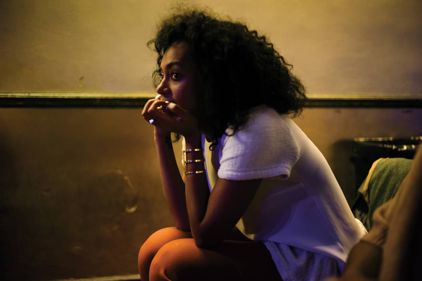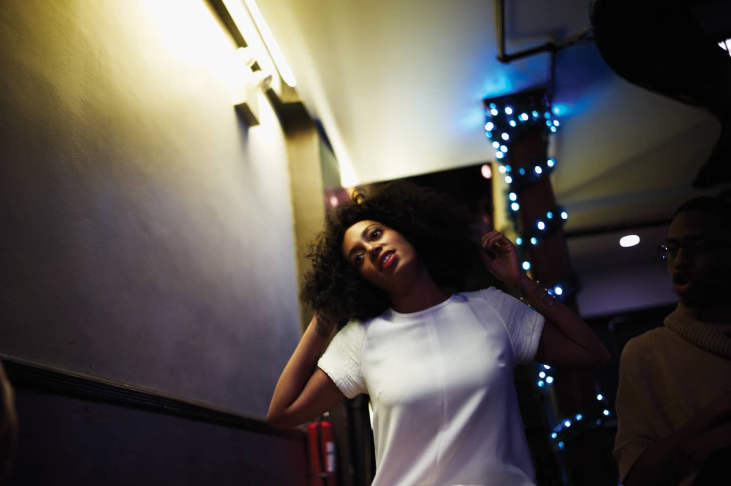 There is a heavenly light in New York’s Bowery Ballroom at two in the afternoon. Being that it’s a nighttime place, few would know it, but the sun just pours in all day long through a wide, arched, south-facing window. It’s at this bright, odd hour that Solange Knowles, as sunny and ethereal as her name would suggest, arrives to rehearse for her second performance in a sold-out run of shows this past December. Dressed smartly in a flounced tunic, a pair of pumpkin-colored trousers and T-strap heels, she looks as if she could just as easily be heading to a job interview, and her hair, the only unruly detail in this otherwise business-chic look, forms a broad, hazy black halo around her delicate features.