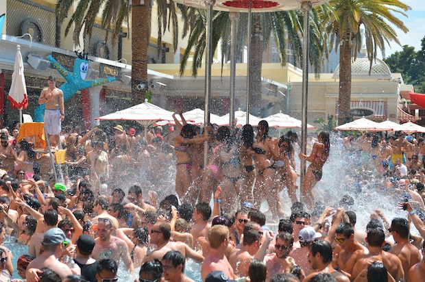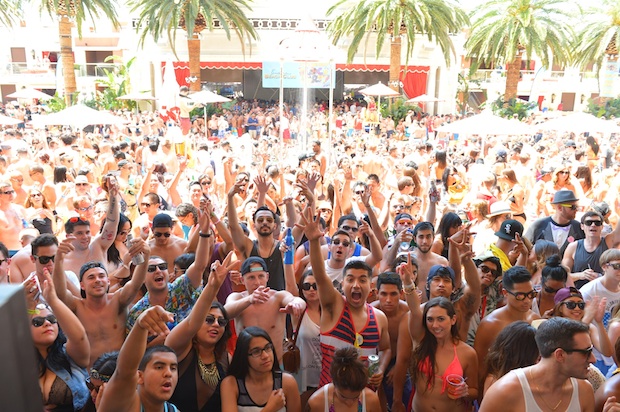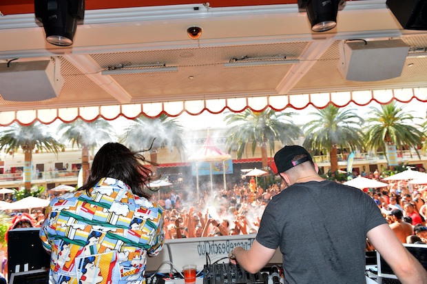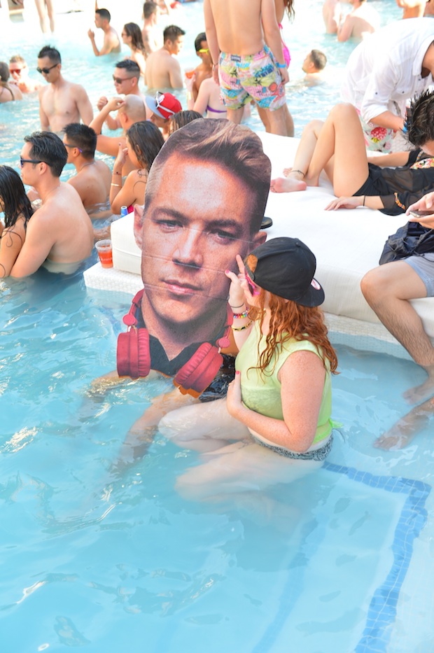 On Saturday, July 20th, with the help of PUMA, Diplo and his Mad Decent crew descended on the Encore Beach Club in sweltering Los Vegas as part of this year's traveling Mad Decent Block Party. Not just relegated to regular old blocks anymore, this one was a pool party complete with massive cut-outs of Diplo's head, so you and like ten of your friends at once could pretend to be the perpetually traveling DJ/Producer/internet personality (ability to make a beat as good as "Look At Me Now" not included with mask). Though the man himself did do a solo set, there were also plenty of great moments from Mad Decent regulars like Paul Devro, Dillon Fancis and Zeds Dead, as well as sets from Djemba Djemba, Torro Torro, ETC! ETC! (double names are hot this year apparently), and Jerome LOL, with whom we filmed a few videos. Look out for those very soon. As wild as it got—you'll probably get some idea from the pictures and the fact that there were 4,000 people there—it's only going to keep ramping up. If you're attending one (or, somehow, all of these) feel free to use hashtag #MDBP2013 to help your friends and interested strangers live vicariously through you. Next stop: Toronto.